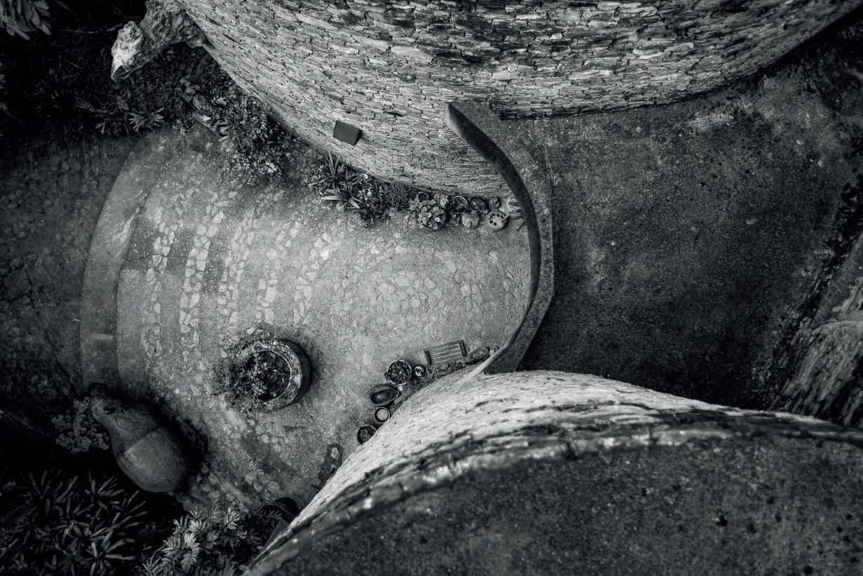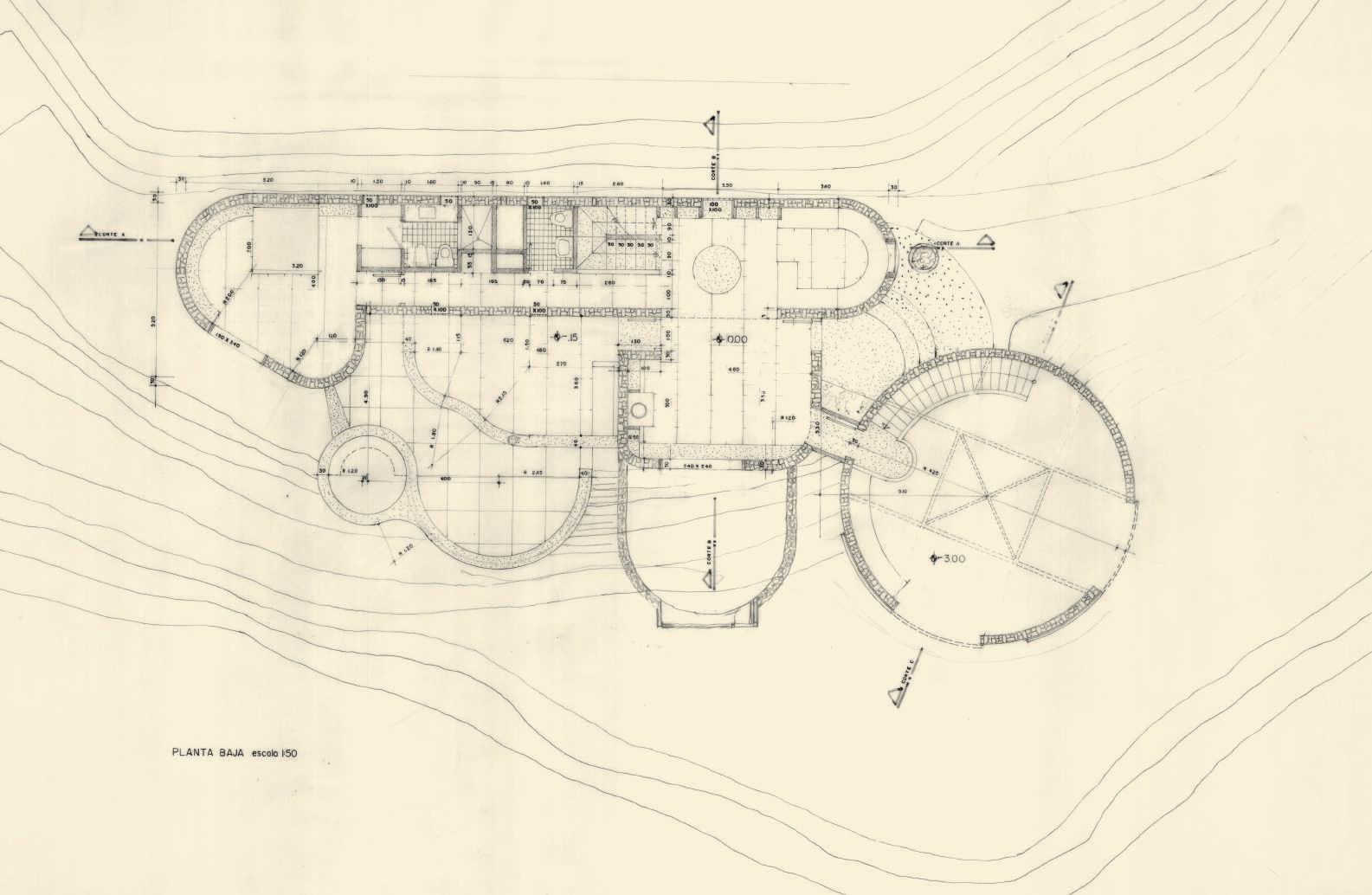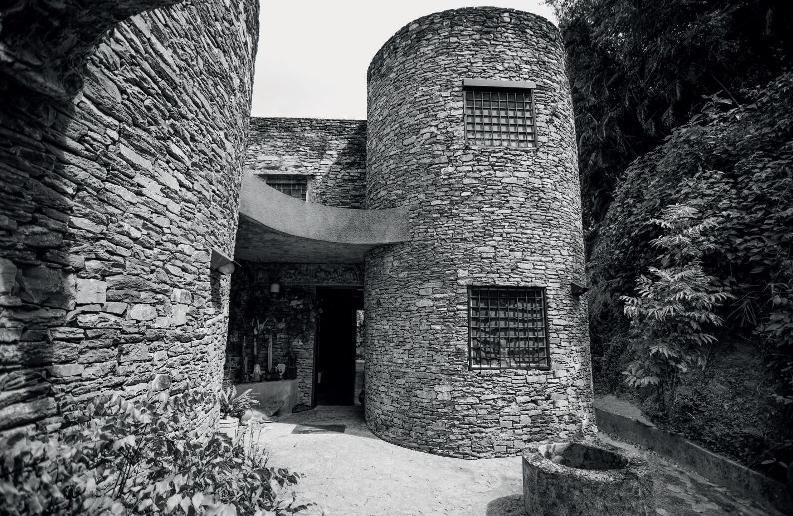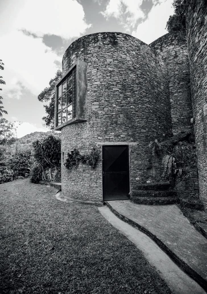 La Mata, estado Miranda. La vivienda está formada por volúmenes cilíndricos y curvos construidos en muros de piedra. Allí se perforan ventanas, permitiendo el paso de la luz y el bosque al interior de la casa, generando dinámicos claroscuros.