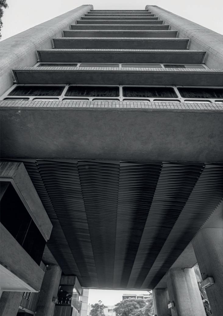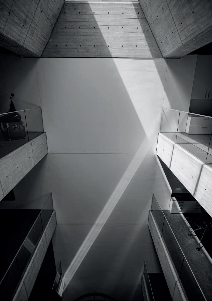 La iluminación juega un papel fundamental y redimensiona un espacio que se eleva y se contrae en formas austeras pero muy fluidas; lo que ocasiona que las masas arquitectónicas tan sólidas y aparentemente pesadas, se desvanezcan ante la sensación de una liviandad muy dinámica. Esto se demuestra a través de la selección de seis edificios claves, en los que se aprecian tres de las características fundamentales de su lenguaje: