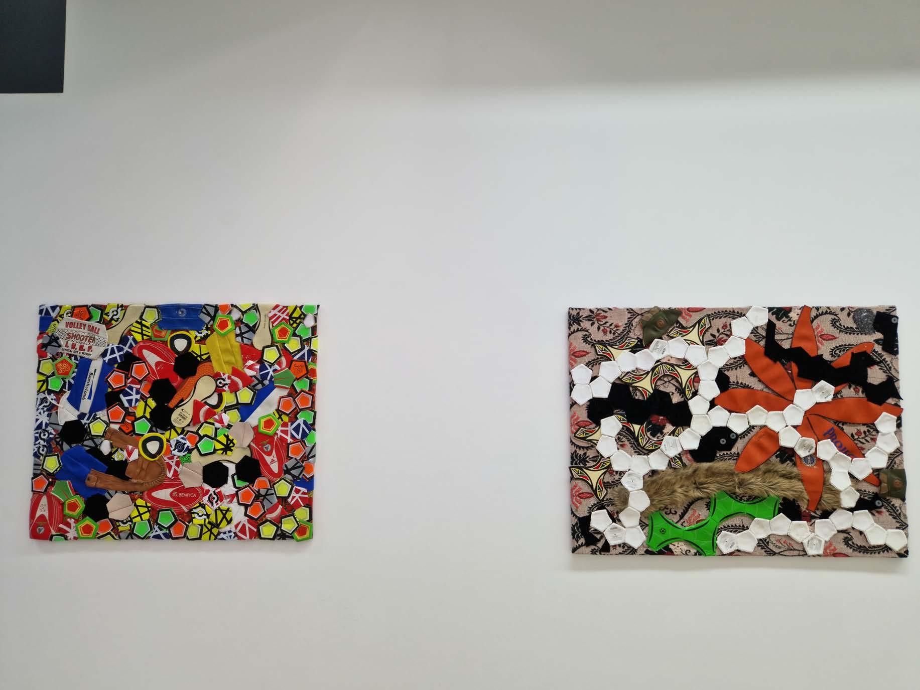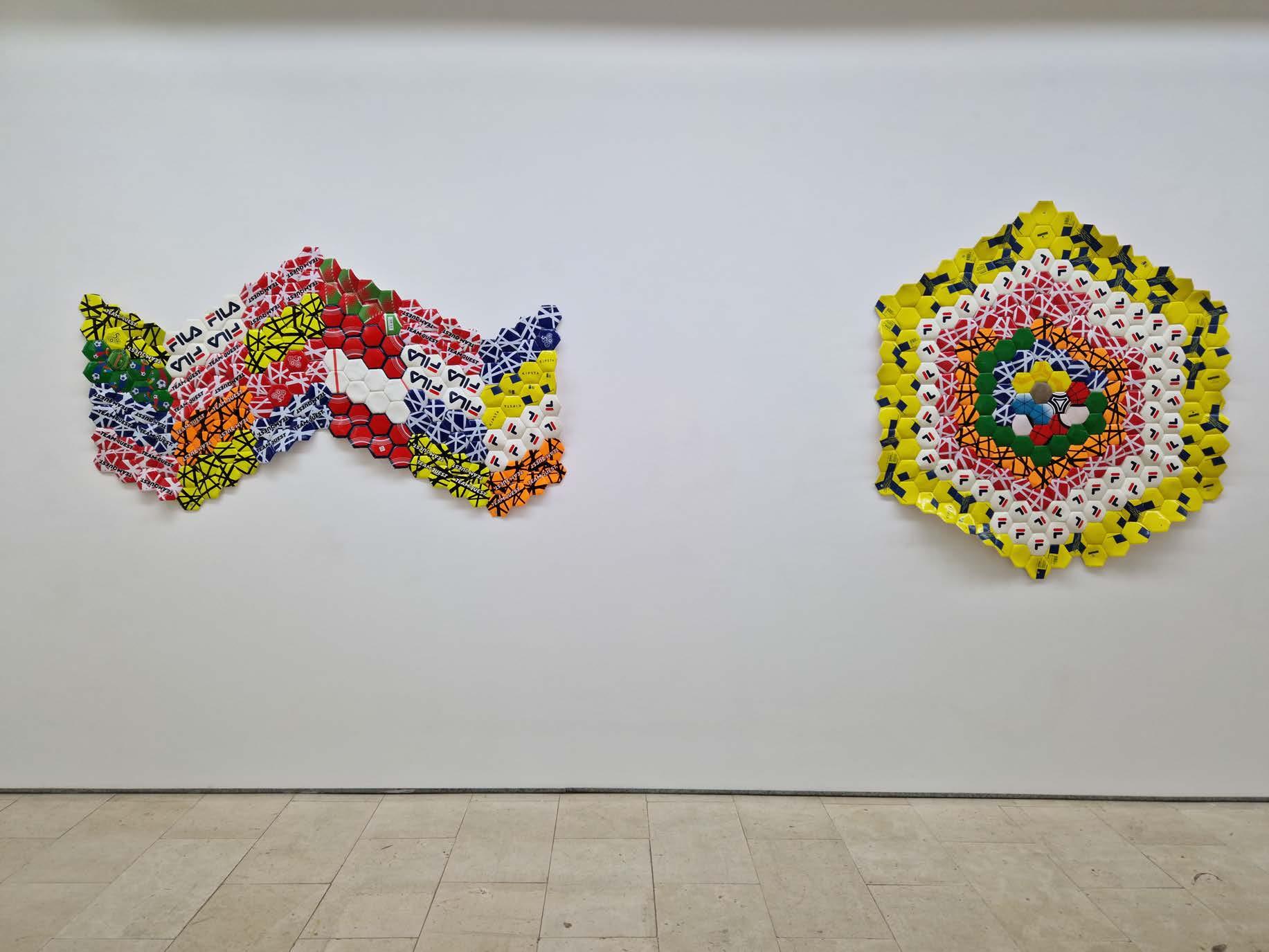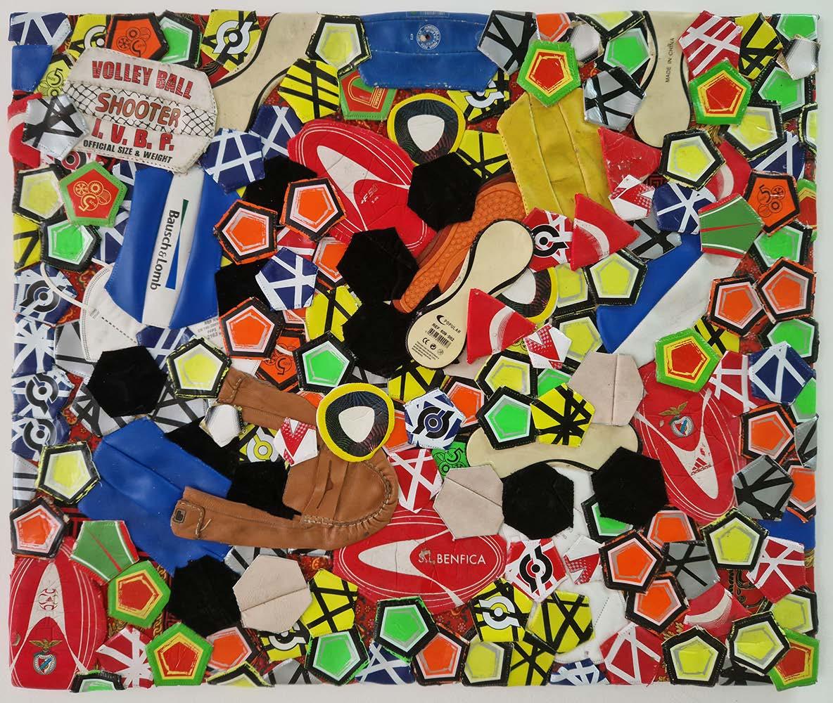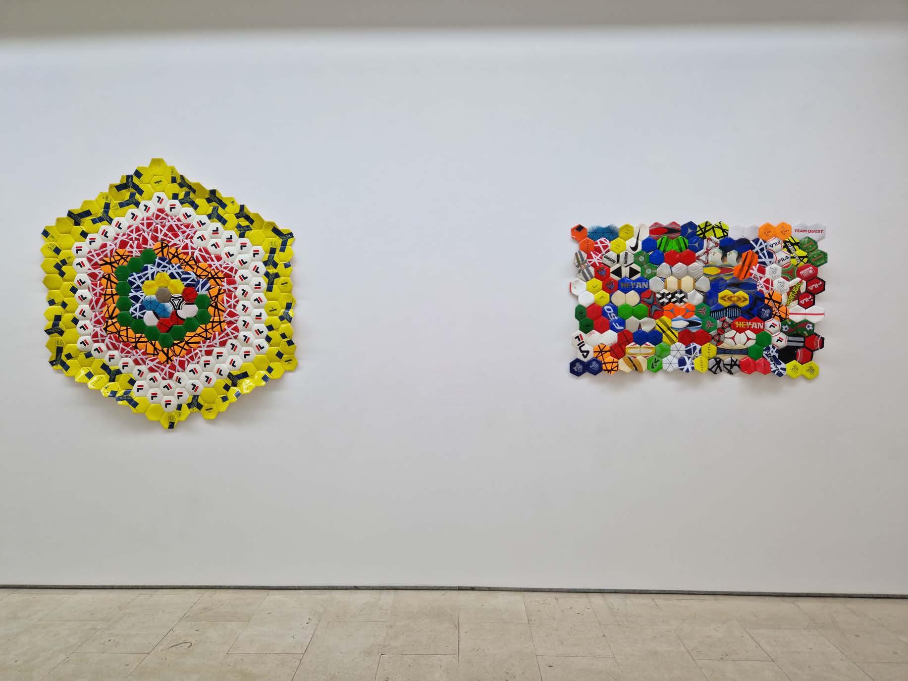 Outra série de trabalhos que estão patentes na exposição são os painéis feitos com bolas de futebol, que são desmontadas e recosturadas, formando planos pictóricos, apenas alterando a geometria da construção dos elementos que compõem a bola, o espaço tridimensional do objeto é transformado em plano. Cada gomo da bola é usado como um pigmento a m de construir essa imagem dúbia, onde, por vezes, o título a remete para poeticas bem distantes na materialidade visível na obra.