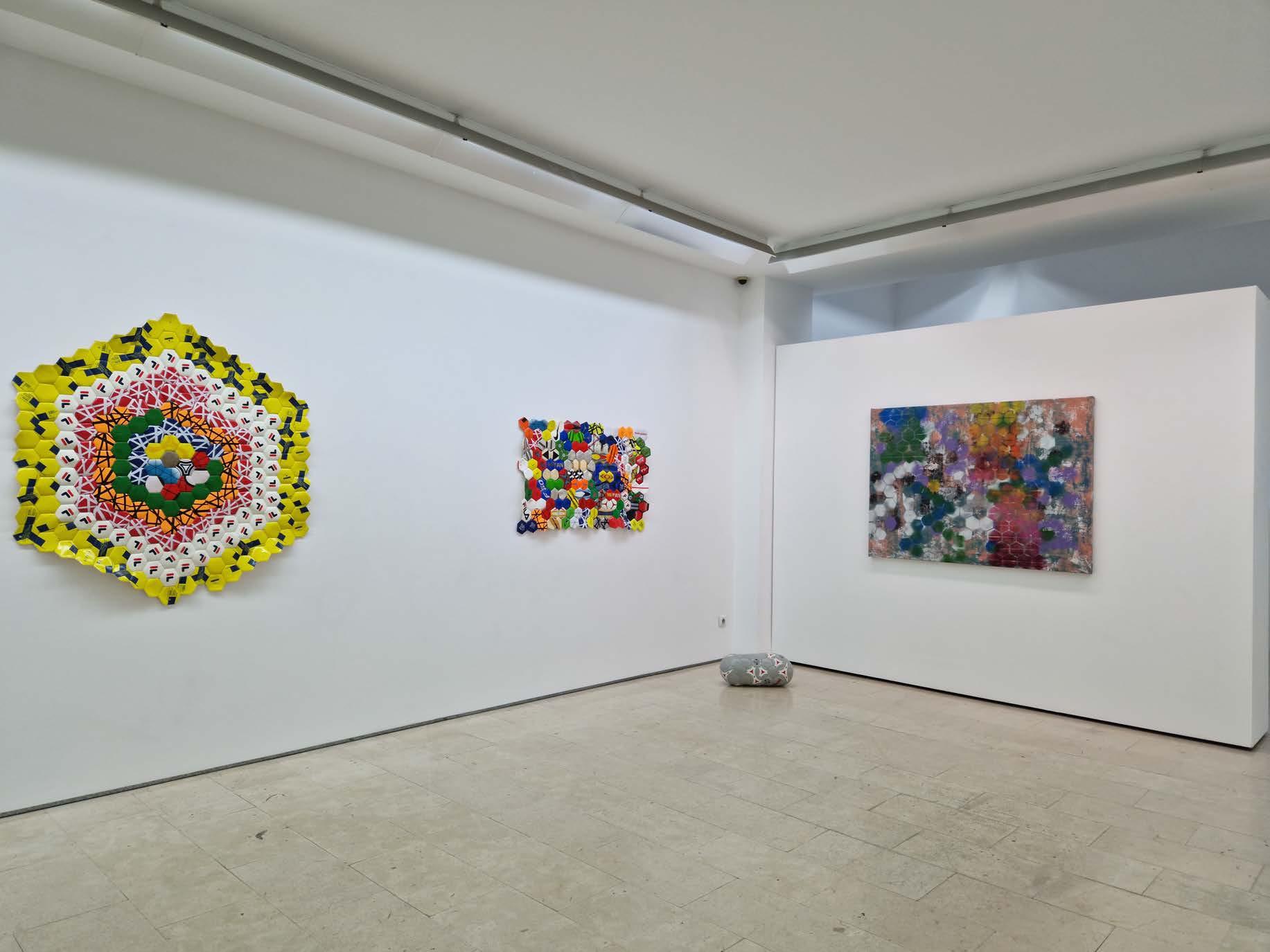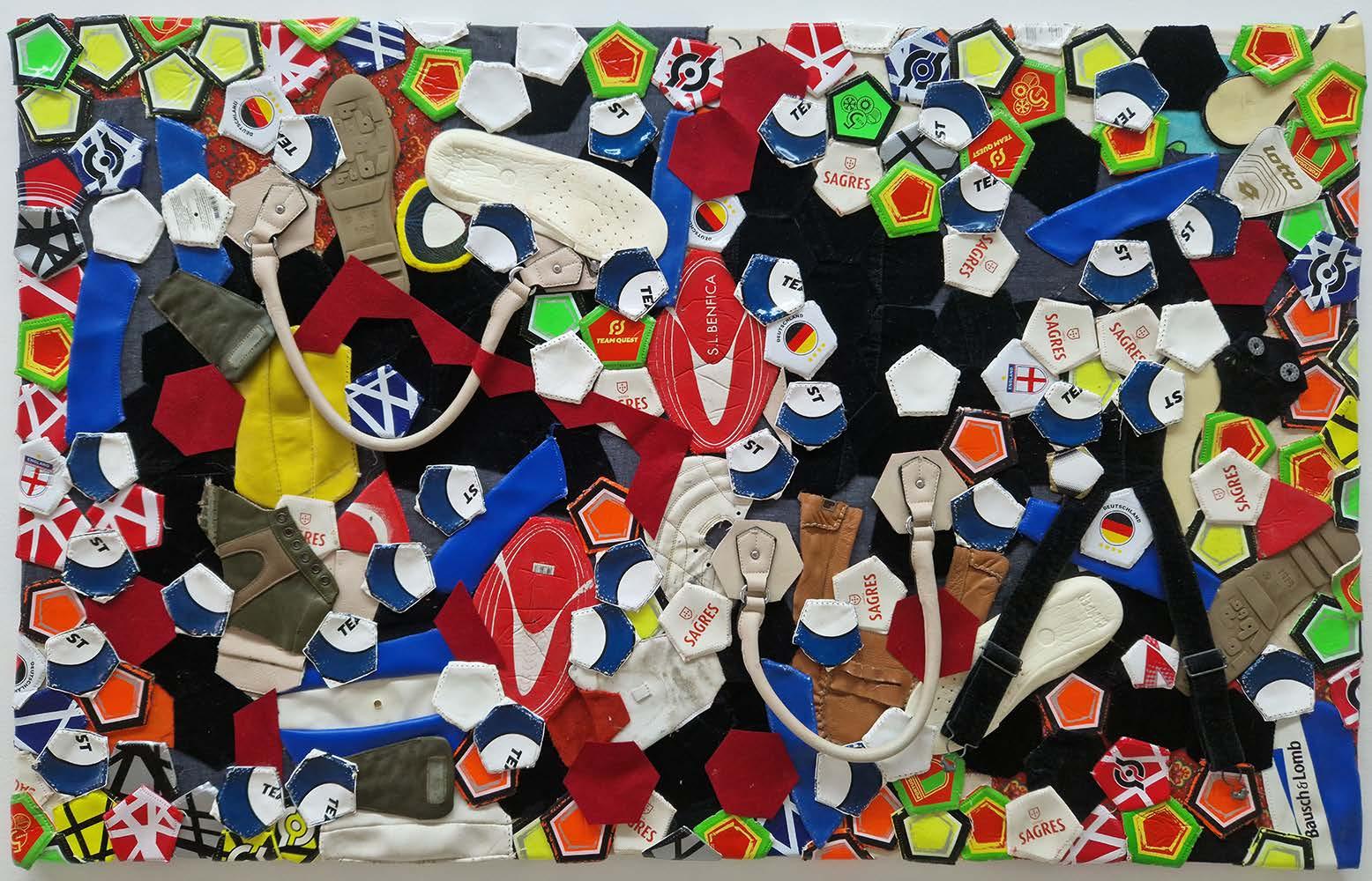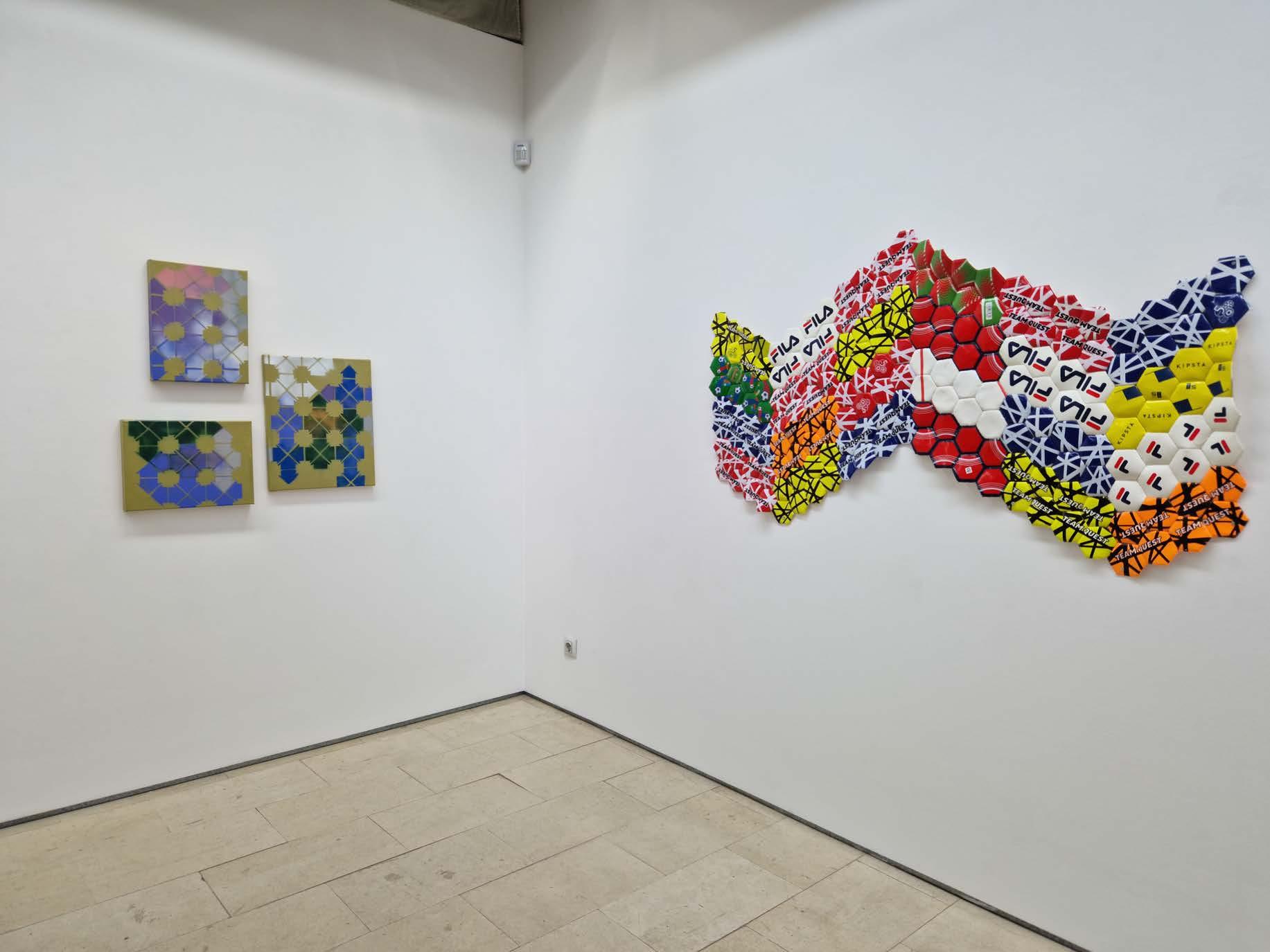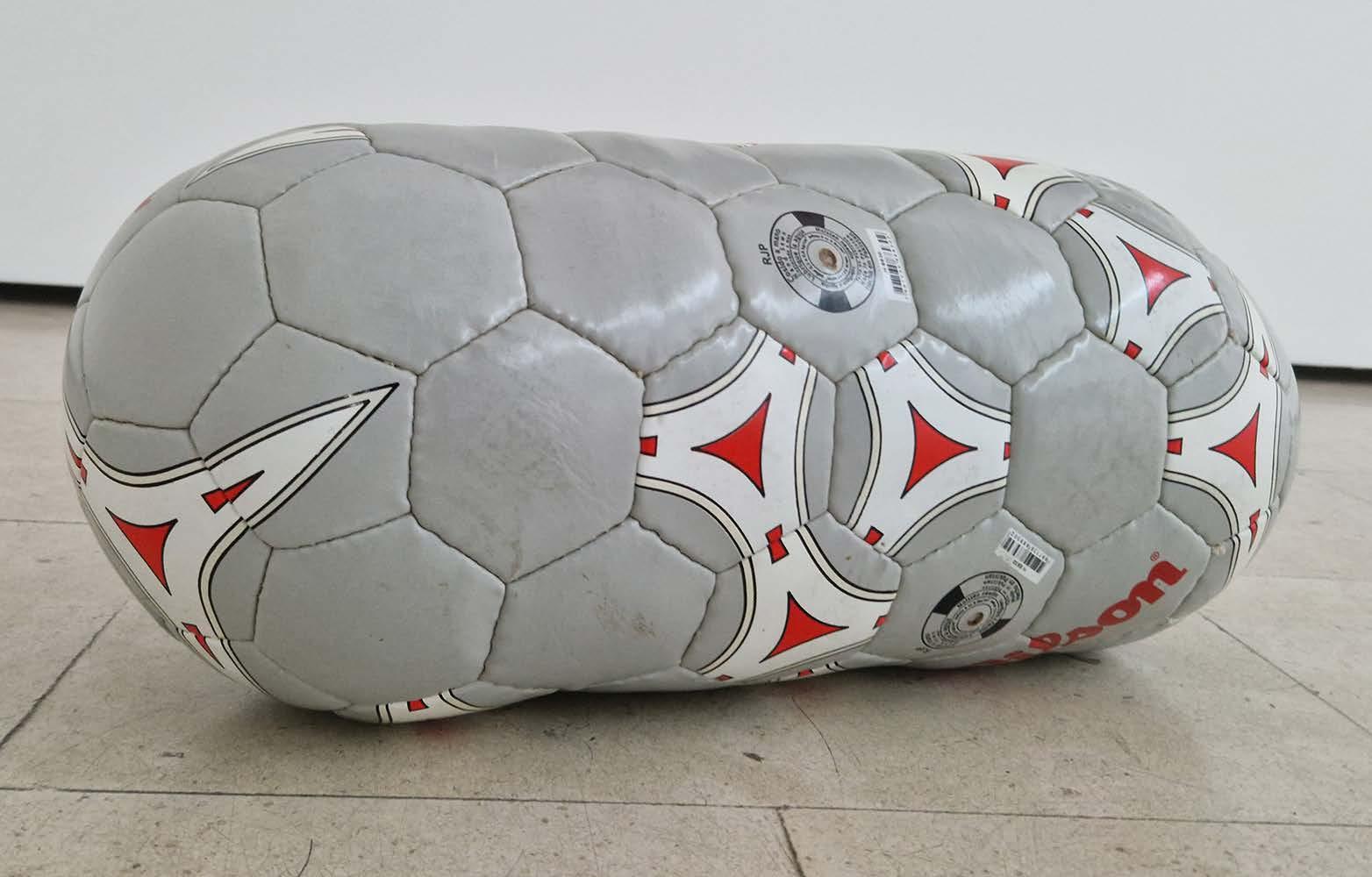 Outra série de trabalhos que estão patentes na exposição são os painéis feitos com bolas de futebol, que são desmontadas e recosturadas, formando planos pictóricos, apenas alterando a geometria da construção dos elementos que compõem a bola, o espaço tridimensional do objeto é transformado em plano. Cada gomo da bola é usado como um pigmento a m de construir essa imagem dúbia, onde, por vezes, o título a remete para poeticas bem distantes na materialidade visível na obra.