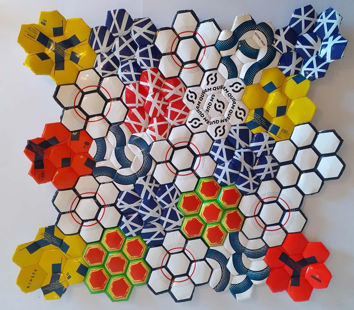 Another series of works that are shown in the exhibition are the panels made with soccer balls, which are dis assembled and recast, forming pictorial planes, only by changing the geometry of the construction of the elements that compose the ball, the three-dimensional space of the object is transformed into a plane. Each bud of the ball is used as a pigment in order to build this dubious image, where sometimes the title refers it to poetics far away in the materiality visible in the work.