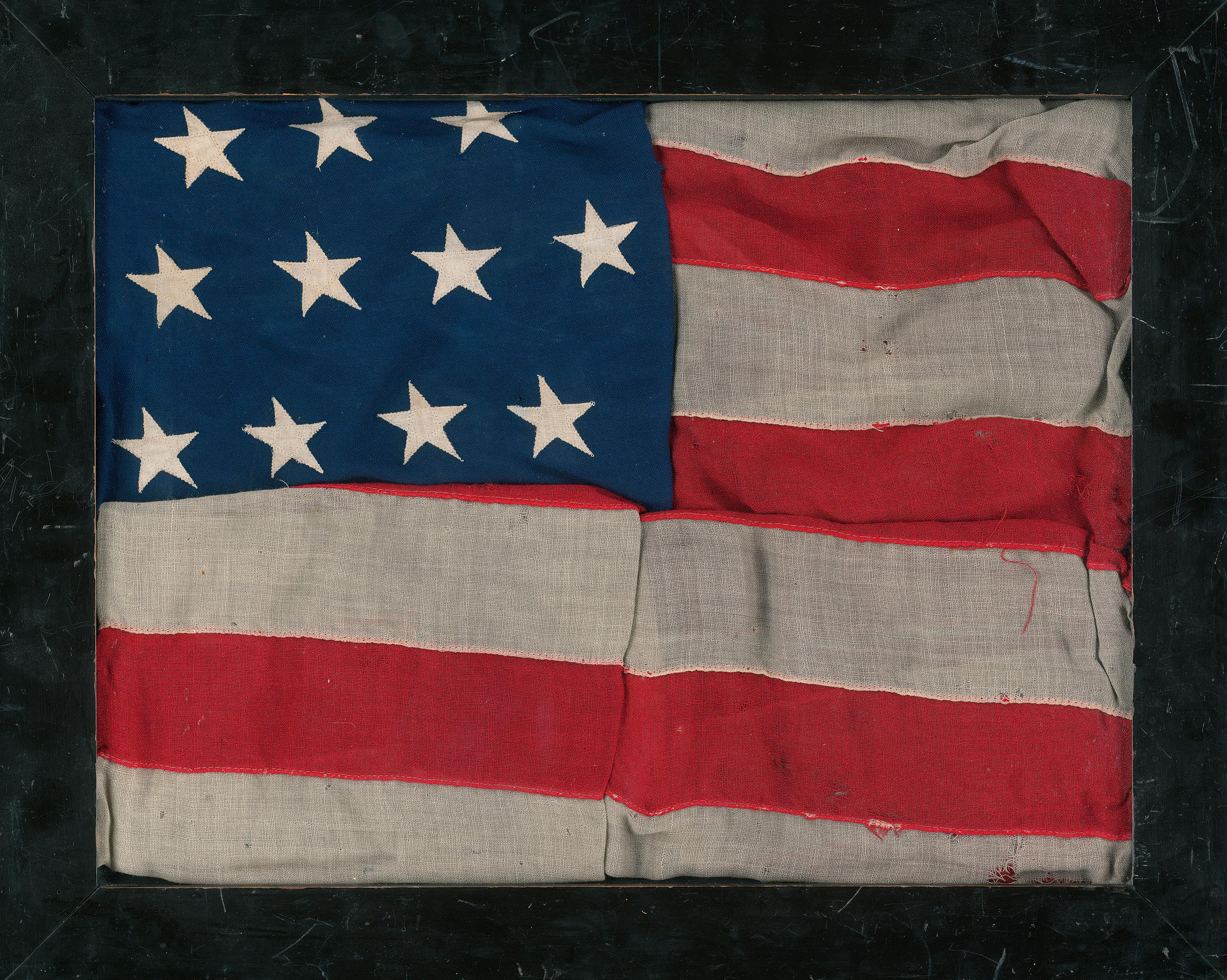 Kunstvoll angeordnete, handgeschmiedete Nägel und Dichtungsringe in einem Schaurahmen. Die Werkzeuge sind von unterschiedlicher Größe und für den Schiffsbau verwendet worden. – Mit Sand- und Kalkablagerungen sowie stärker oxidiert. Die Verbindung von Sand und Oxidation ergibt eine sehr glänzende und intensive Türkisfärbung. Sehr dekorativ. – Dabei: 4 verschiedene Eisennägel, ein Eisenhaken und ein Eisenring. 17 x 1 cm bis 11 x 3 cm. Um 1800.