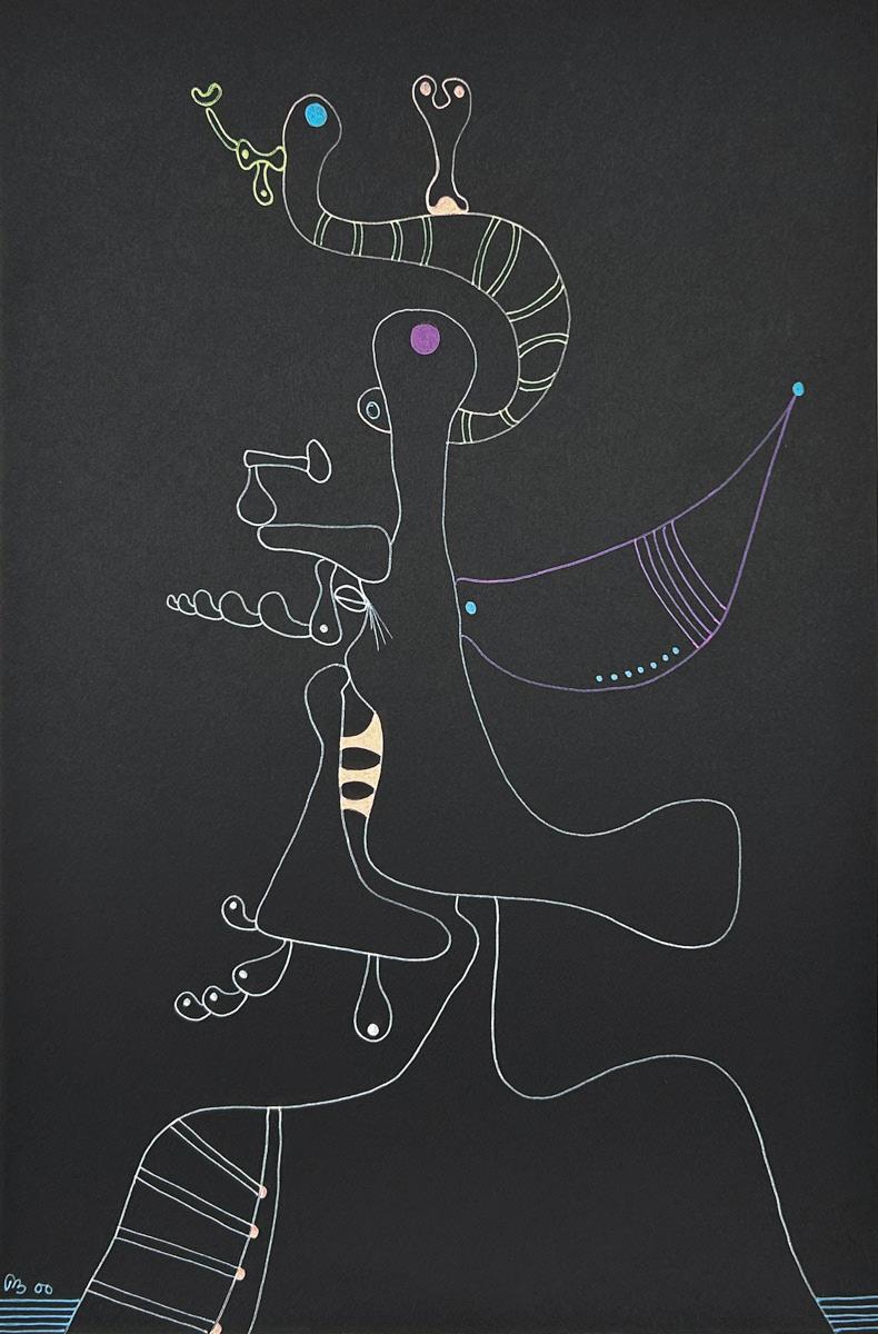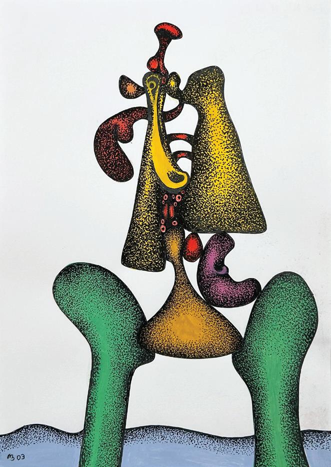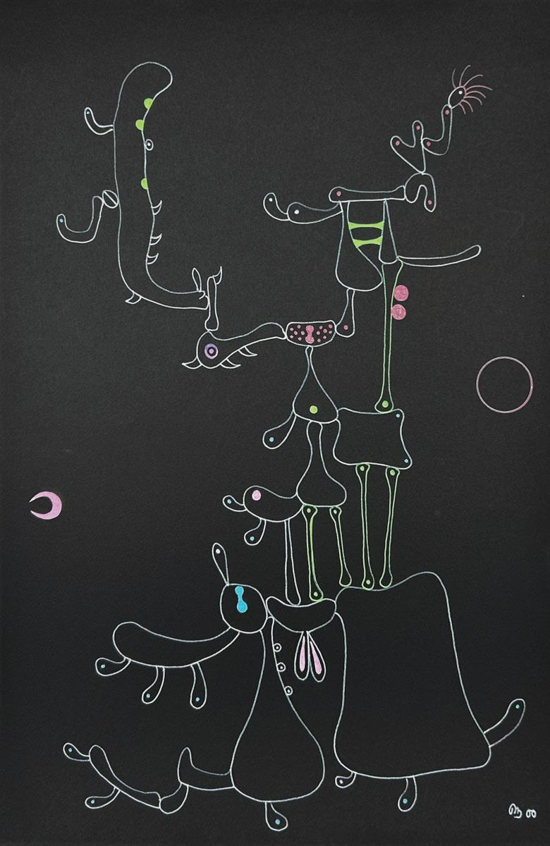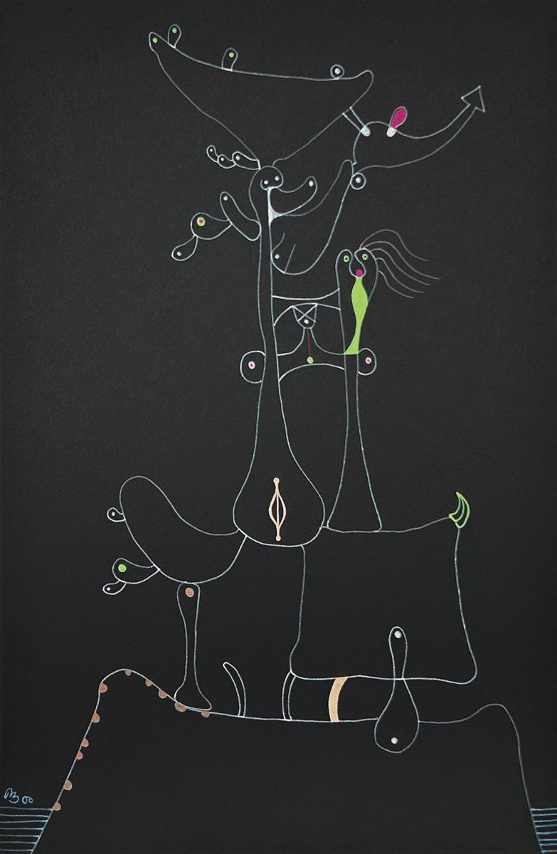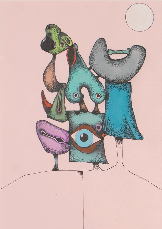 Desmond Morris is a renowned zoologist, anthropologist, best-selling author, and the last surviving artist of the Surrealist movement. While studying zoology at the University of Birmingham, he began drawing the biological forms he observed under a microscope, which evolved into his distinctive Surrealist imagery—a “menagerie of creatures that were all his own” according to David Attenborough. Though informed by biology, Morris’s invented biomorphs are irrational and imaginative, developing freely on the canvas while remaining meticulously executed. Influenced by artists like Joan Miró and Yves Tanguy, this visual language has remained central to his work throughout his career.