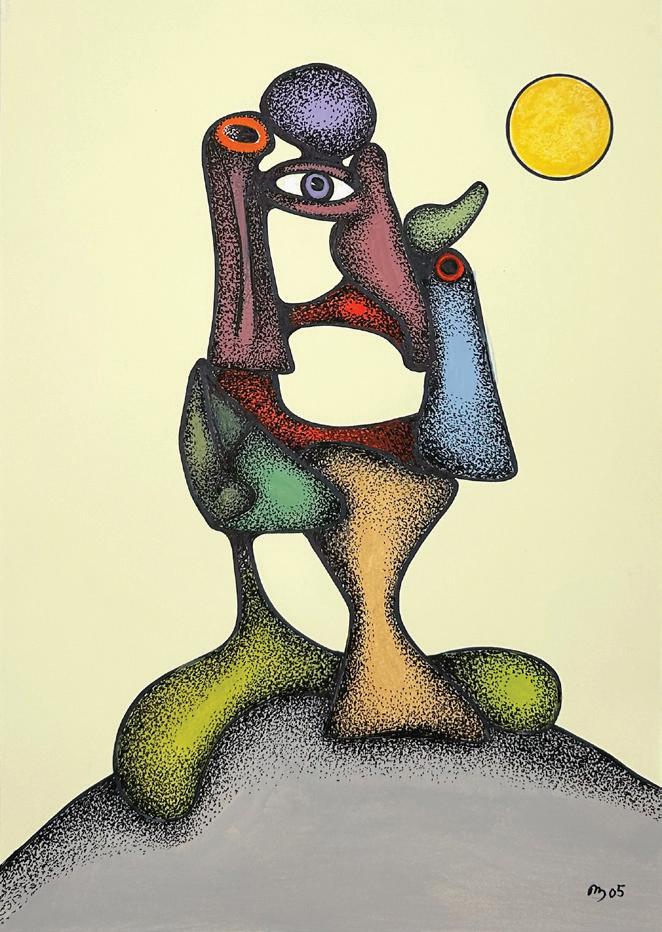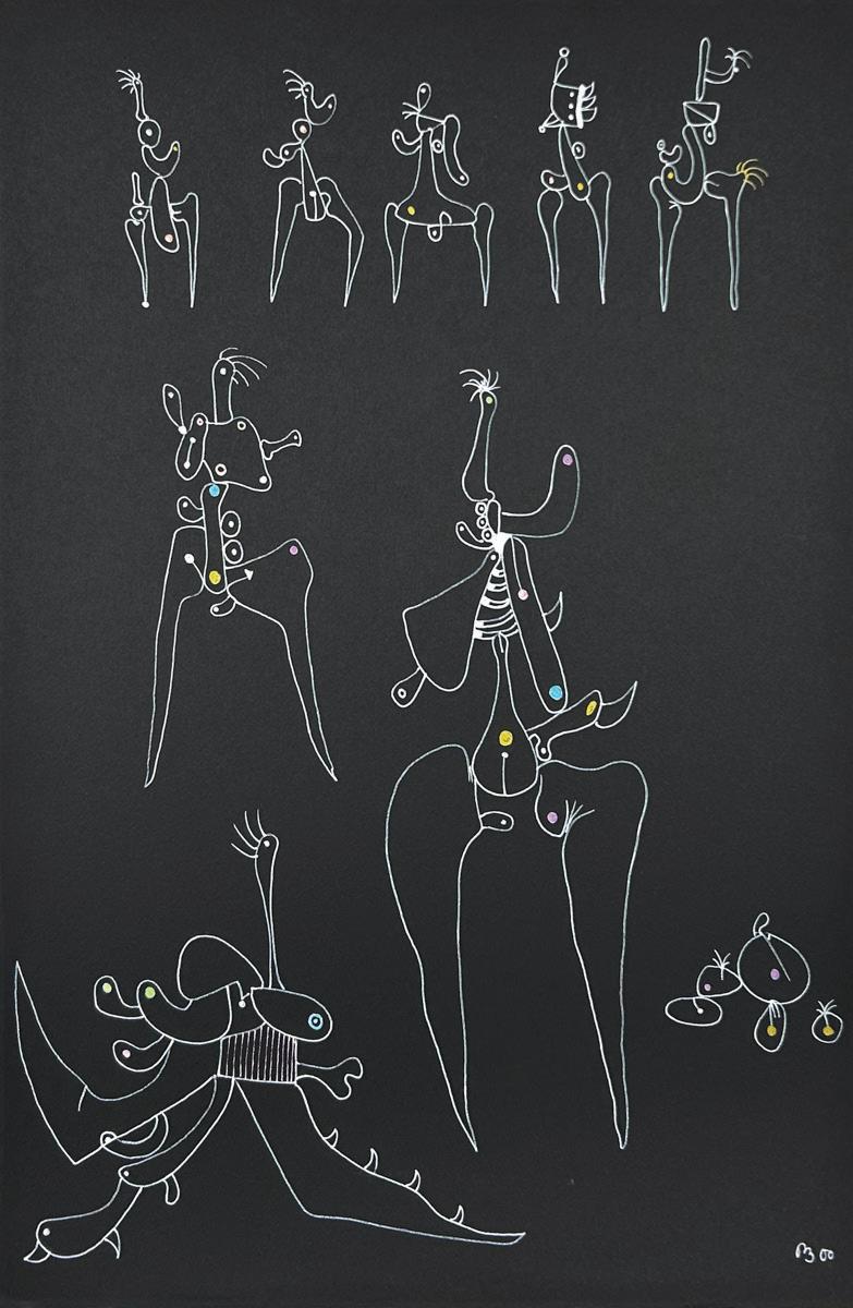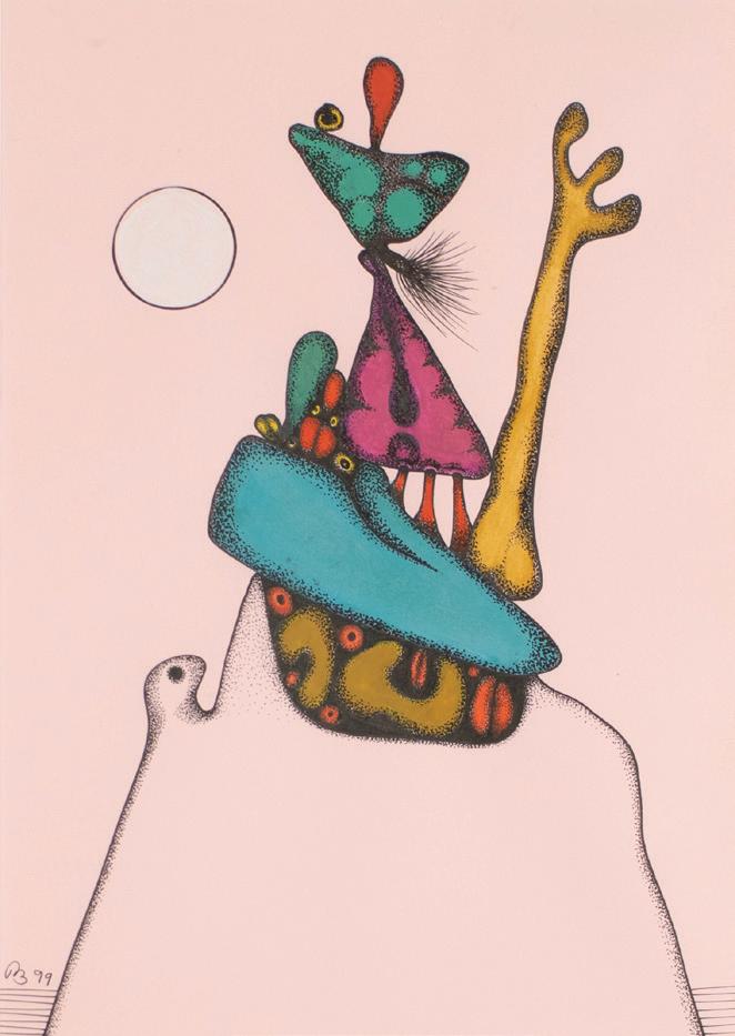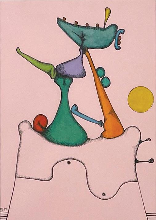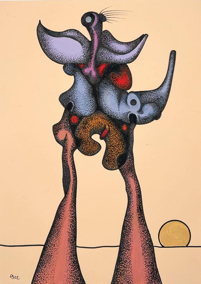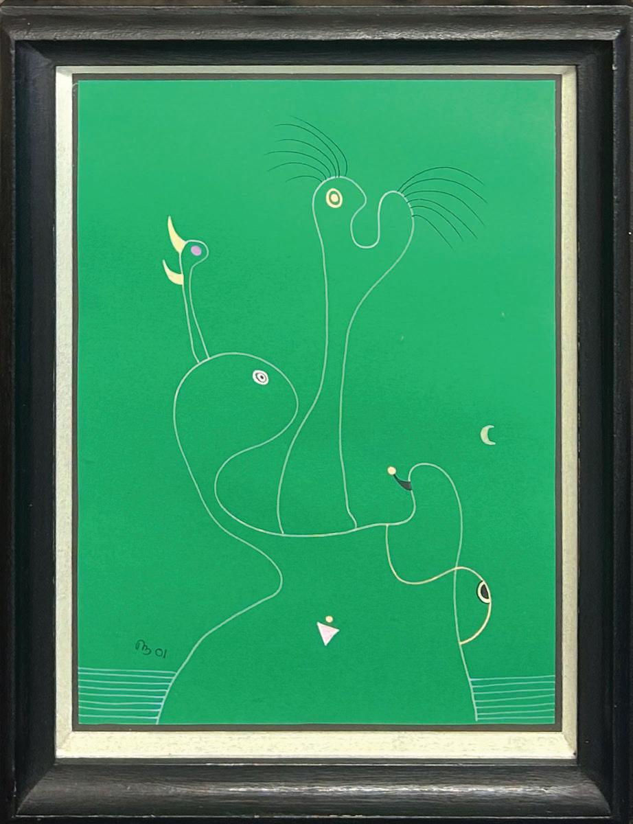 Desmond Morris is a renowned zoologist, anthropologist, best-selling author, and the last surviving artist of the Surrealist movement. While studying zoology at the University of Birmingham, he began drawing the biological forms he observed under a microscope, which evolved into his distinctive Surrealist imagery—a “menagerie of creatures that were all his own” according to David Attenborough. Though informed by biology, Morris’s invented biomorphs are irrational and imaginative, developing freely on the canvas while remaining meticulously executed. Influenced by artists like Joan Miró and Yves Tanguy, this visual language has remained central to his work throughout his career.