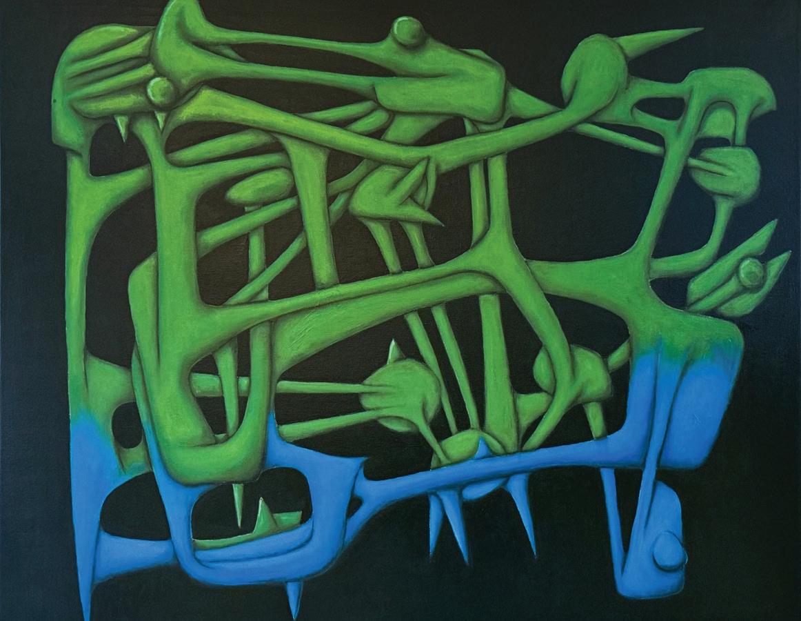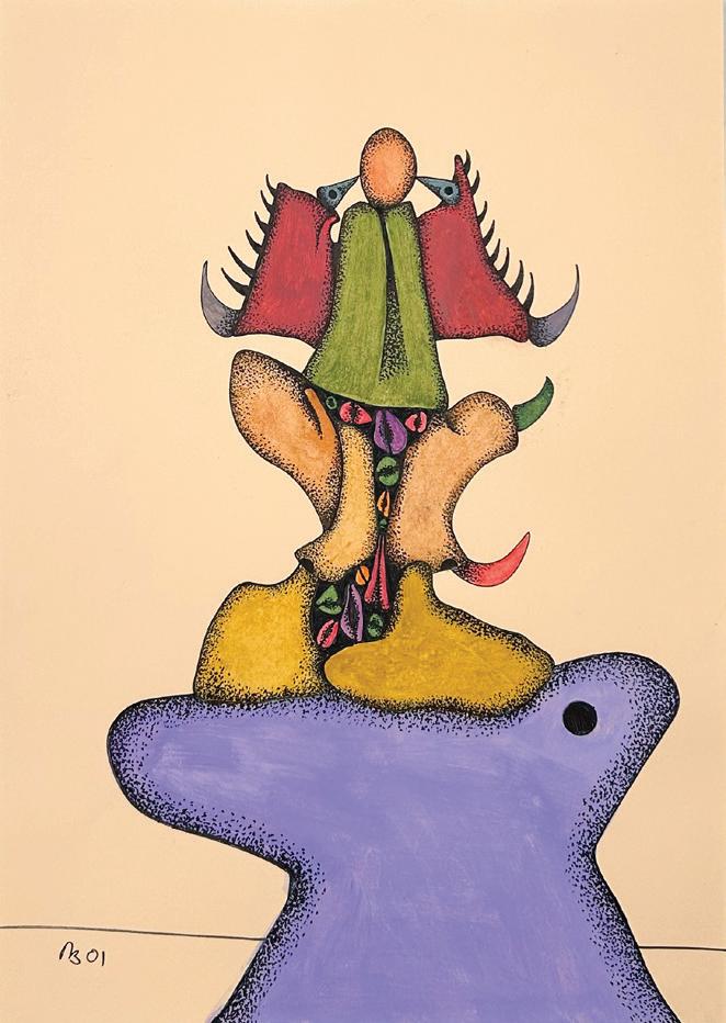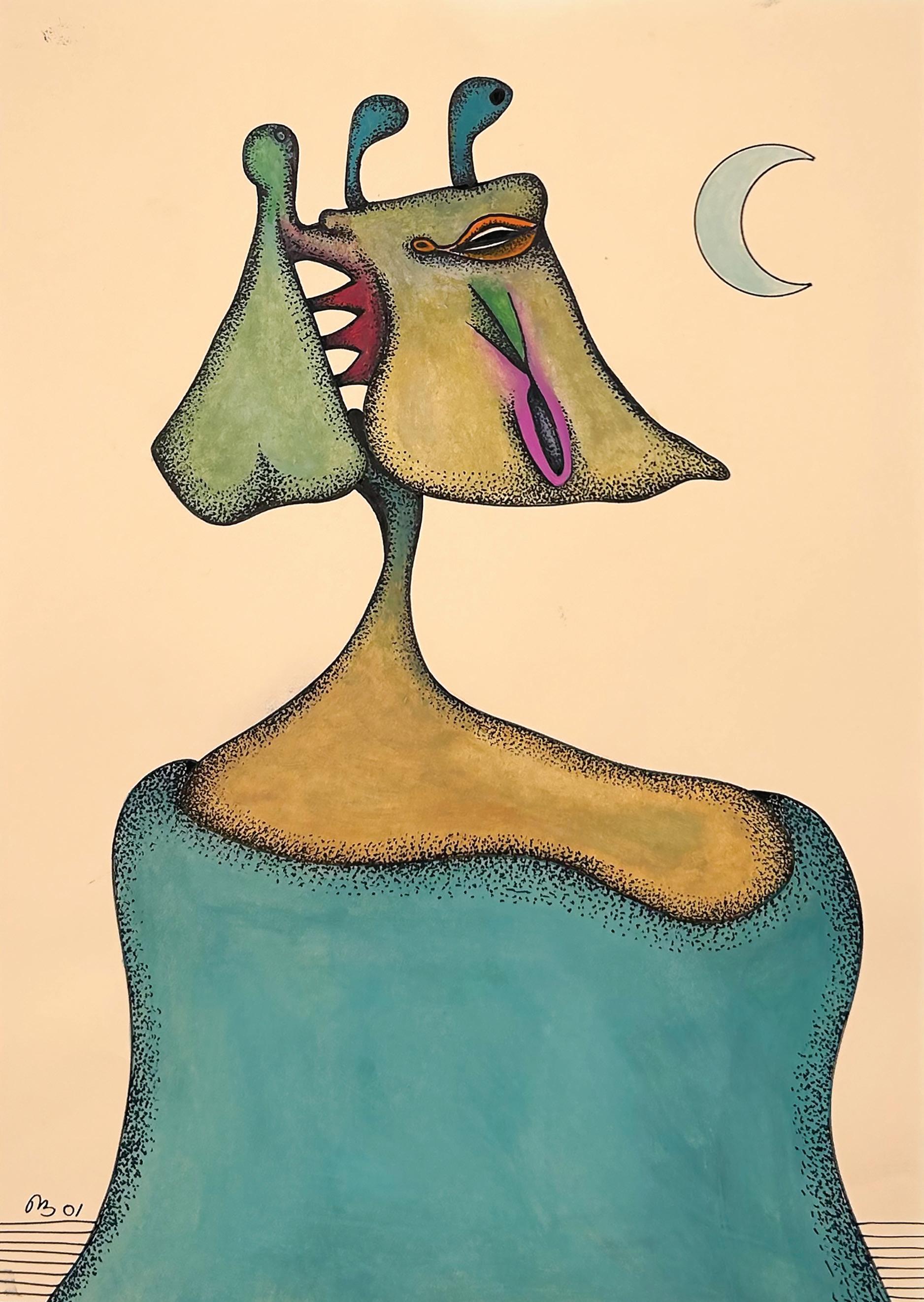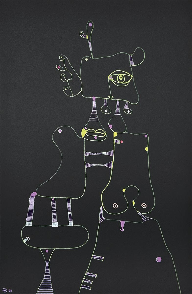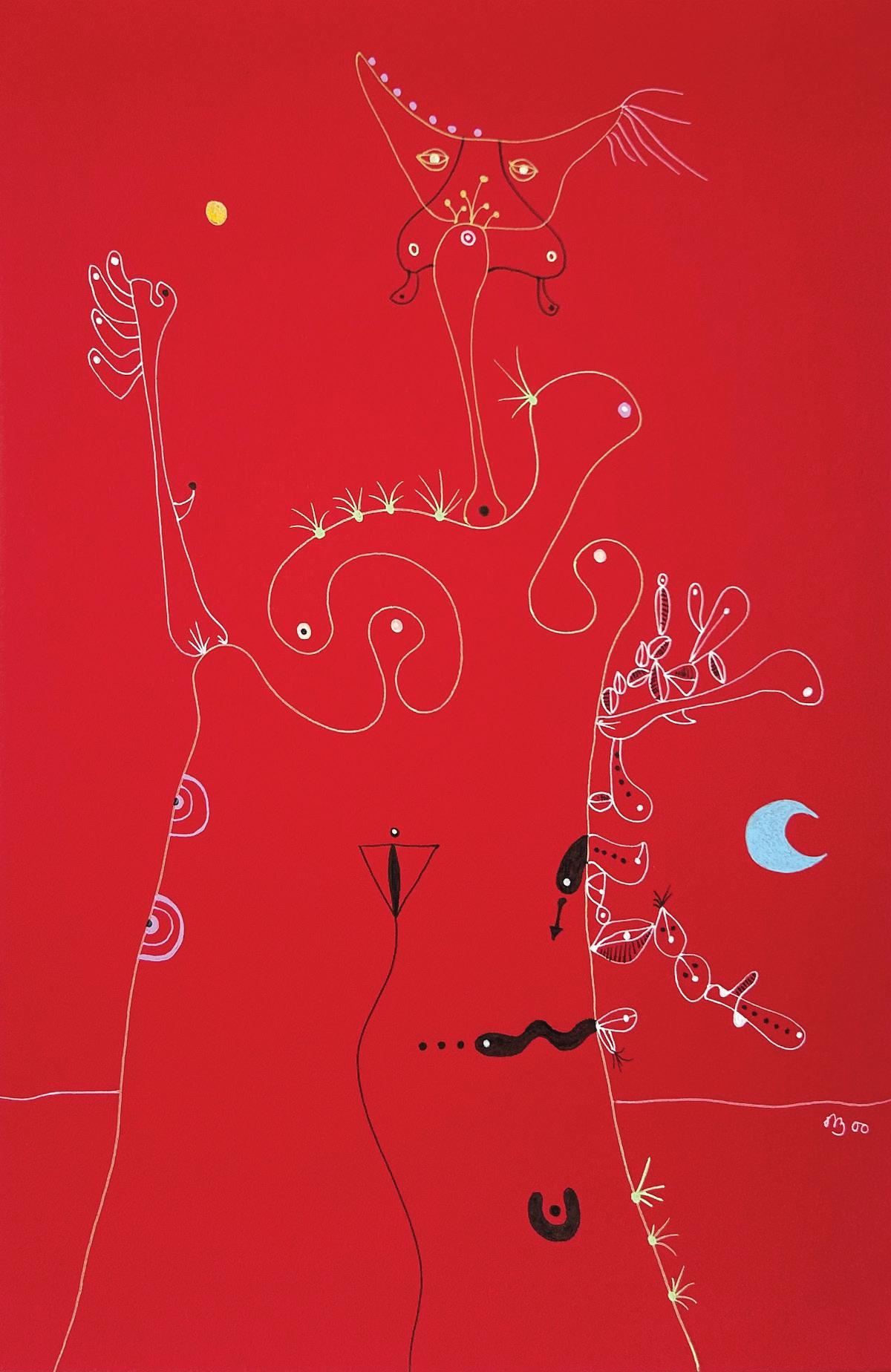 Desmond Morris is a renowned zoologist, anthropologist, best-selling author, and the last surviving artist of the Surrealist movement. While studying zoology at the University of Birmingham, he began drawing the biological forms he observed under a microscope, which evolved into his distinctive Surrealist imagery—a “menagerie of creatures that were all his own” according to David Attenborough. Though informed by biology, Morris’s invented biomorphs are irrational and imaginative, developing freely on the canvas while remaining meticulously executed. Influenced by artists like Joan Miró and Yves Tanguy, this visual language has remained central to his work throughout his career.