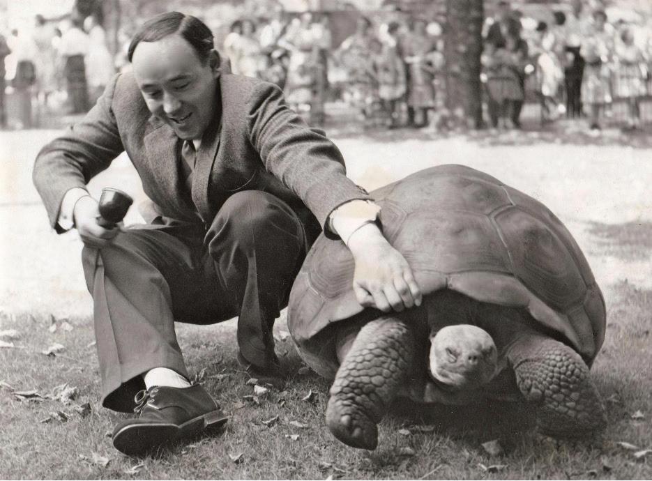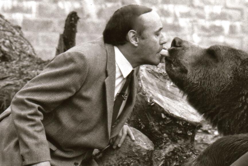 Left, top to bottom: Desmond Morris pictured feeding a grizzly bear a banana; Morris pictured with a large tortoise; Congo, the chimpanzee, painting at London Zoo in 1957.