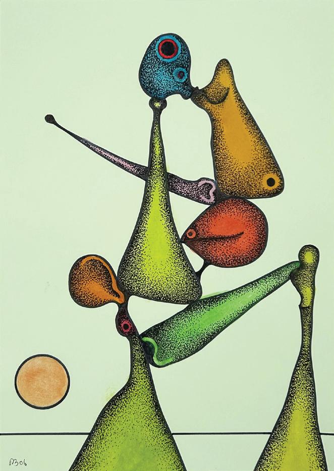 Following the celebrations for his 95th birthday on January 24th, 2023, Morris began a long series of biomorphic A4 watercolours on paper. These were of a special kind. In previous years, he had made many black ink drawings. These were stored in drawers, one drawer for each year. Searching though these, he selected some that he felt could be improved by the addition of watercolour. The backgrounds were left untouched and only the figures themselves had the coloured paints added. Once the paint had dried, inkstippling was applied to give the shapes more solid bodies. The dates on these watercolours refer to the original black ink drawings. They are relevant because they indicate when the actual image was first created. The added colours and stippling all date from January to May 2023.