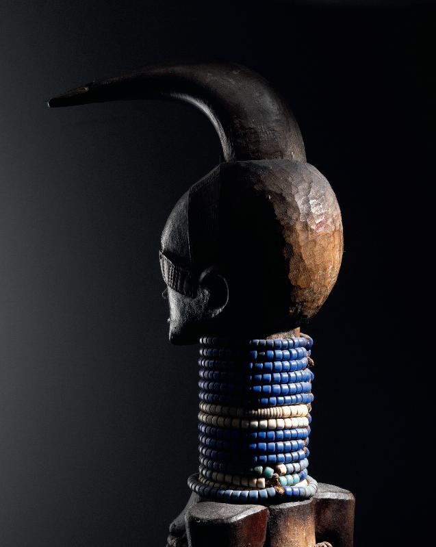 Ces effigies magistrales jouent un rôle considérable dans la pensée et l’imaginaire de ces clans et villages. Elles sont attribuées aux grands ancêtres, esprits des chefs fondateurs ou de grands notables. Ils sont vénérés en tant que gardiens de lignage15, protègent la communauté villageoise et assurent la fécondité des femmes16. Le visage piriforme, elles sont étirées, bras écartés tombant droit, de larges pieds en raquette débordant du socle élevé et conique. Pagnes, colliers de perles, corne servant de réceptacle et autres ingrédients magiques donne à cette effigie une énergie redoutable.