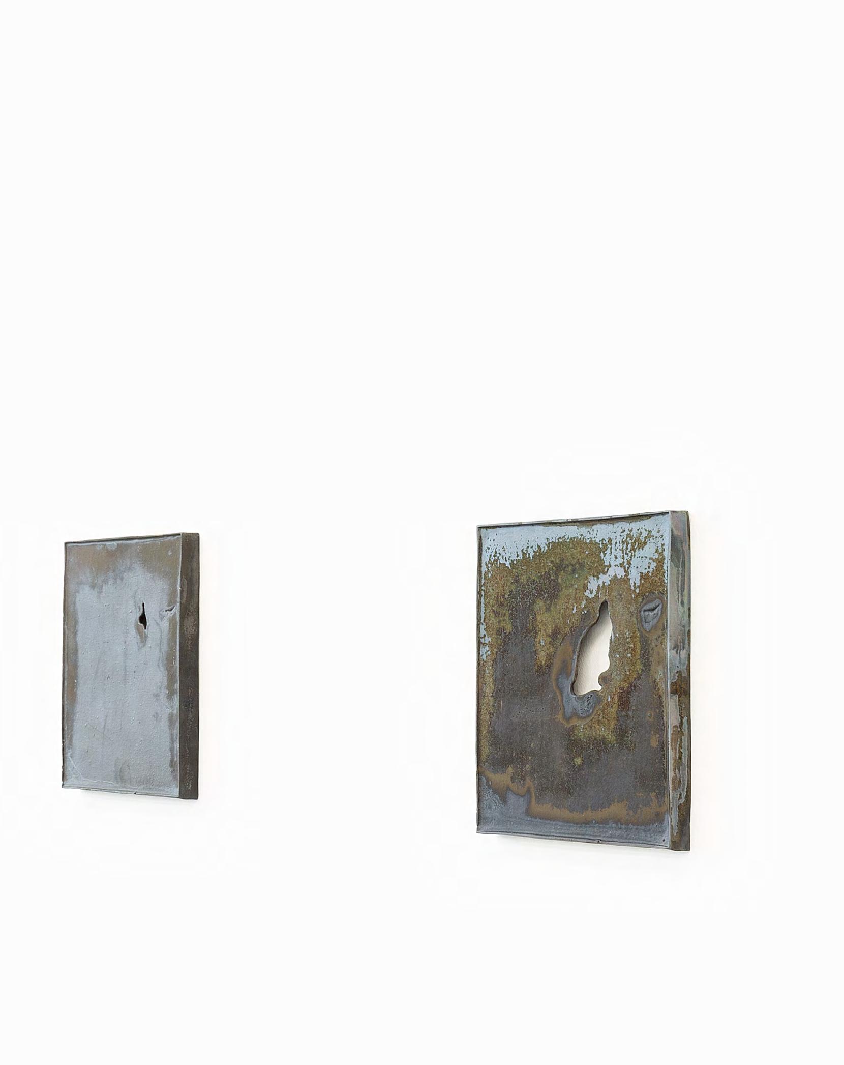 Thomas Supper deals with the question of how material decays and what remains when form and substance dissolve. His series Reduktionen (since 2023) begins with a single black painting that is repeatedly cast in bronze. With each casting, the image shrinks, losing sharpness, mass
