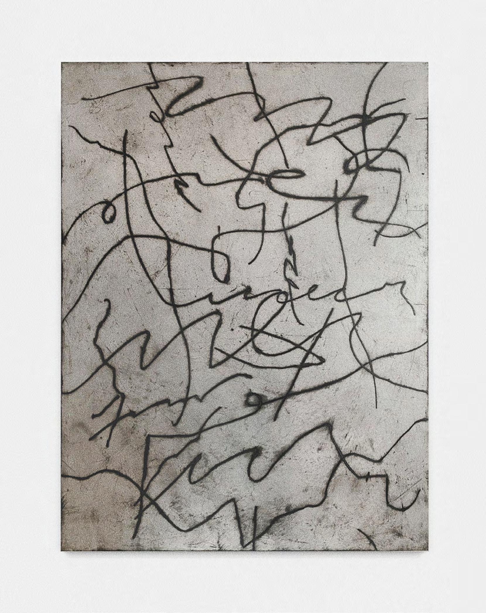 If Koenig had a conceptual constant, it would be the way he treats the the art-historical canon like a library of references to be called on: the legacy of gestural expressionism is evident in his abstract aluminium panels, nods to Primitivism and etchings are visible in his scrappy, drawing-like paintings. Koenig’s work is grounded in an investigation of abstract painting through a postmodern repurposing of signs and symbols. His work is in constant dialogue with what came before and what is happening around him. It’s like sampling from history and culture, remixing it into his own unique sound. Gestures and figures are entangled with lines in the paintings to test the meaning and visual resonance of language. The etched lines are the foundation of the abstract works on top of which he employs an array of techniques including dragging, rolling, washing and stencilling – to control increasingly dynamic iterations from his established repertoire. This approach has become more complex over time, as the artist explores the effects of repetition, scale, rhythm, and different means of overpainting, to achieve the desired surface.