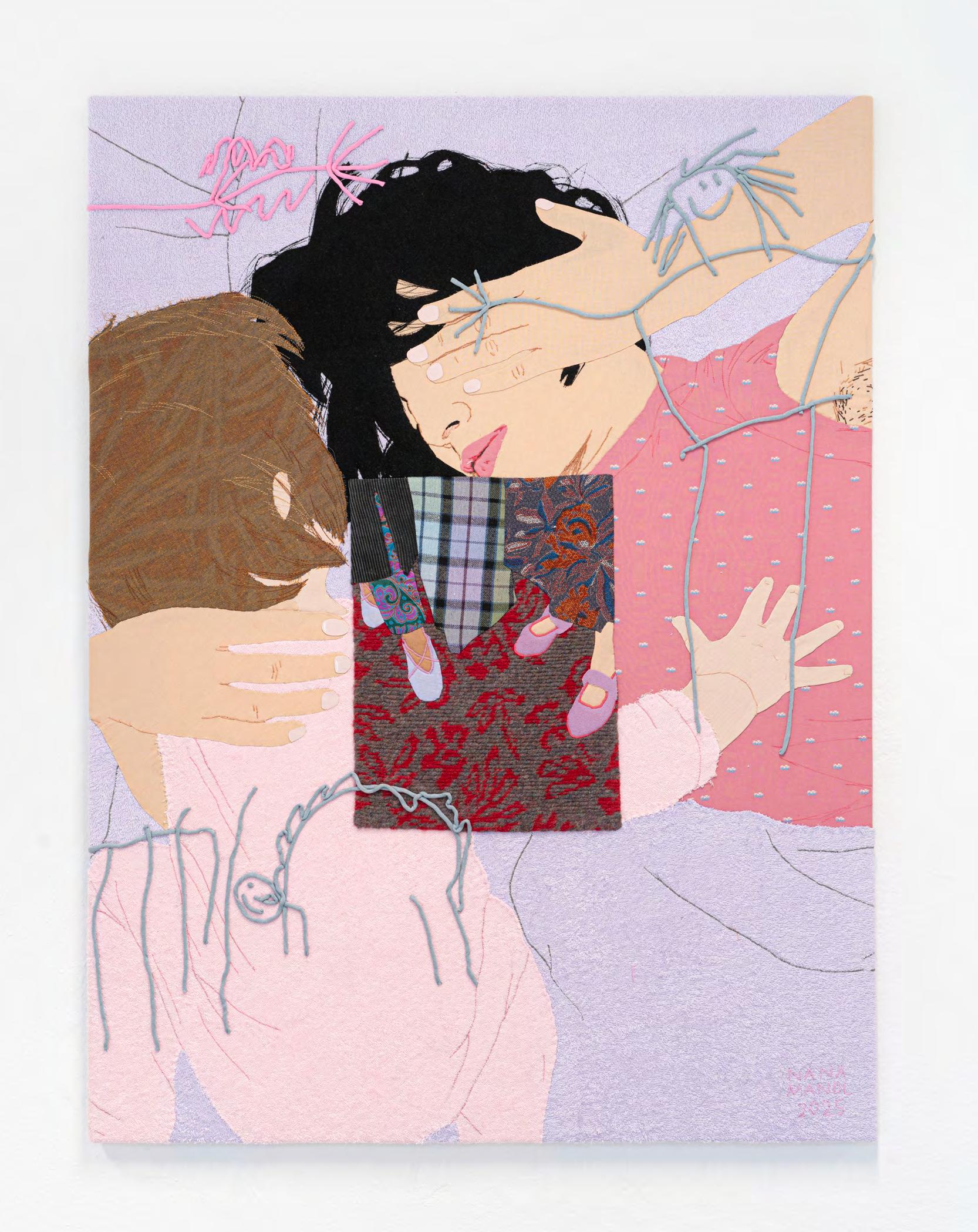 Nana Mandl, no time for regrets, 2025, textiles, embroidery and tube yarn on canvas, 90 × 120 cm. Photo by Nana Mandl