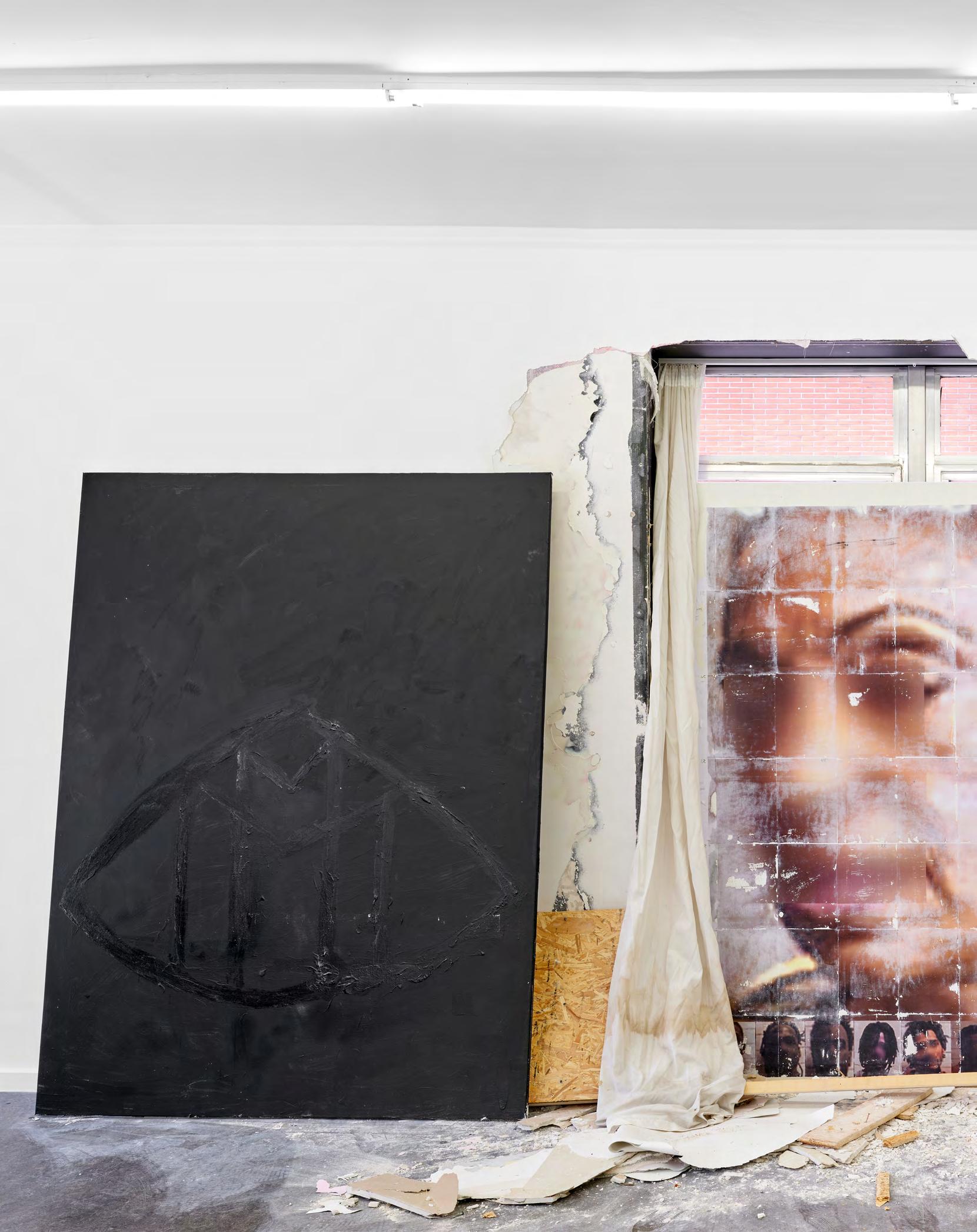 Born in Washington D.C., Allen-Golder Carpenter combines sculpture, sound, painting and photography into a polyphonic network that explores cultural identity, surveillance and movement. At its center lies the question of how physical and symbolic borders emerge and how they can be dissolved again. In the installation Jazz Window (2025), this principle becomes directly tangible. Printed film panels with fence motifs hang freely in the space and are set in motion by fans. The supposed barrier begins to breathe, and border structures start to flow. The illusion of the fence refers to national control, deportation and state violence, while at the same time pointing to the utopian moment of freedom of movement. Another work shows masks on the floor as relics of violent, anonymous authority, referencing and inverting the aesthetics of urban subculture.