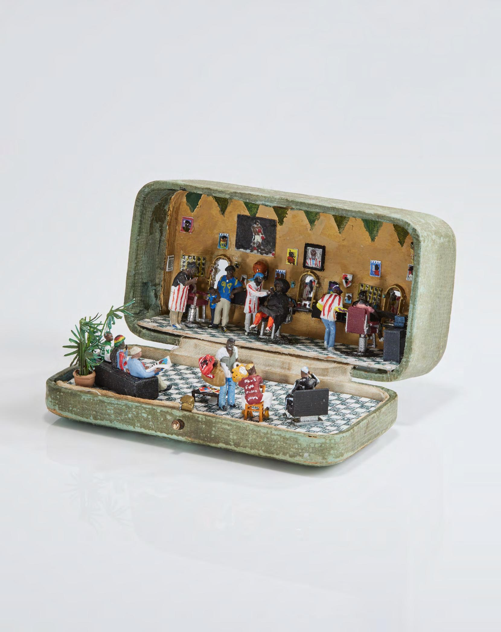 BARBER ON THE DAMN PHONE! BRUH, CAN YOU PLEASE FINISH MY FADE?!, 2022, mixed media in reclaimed jewellery box on custom coloured Finnish birch plywood pedestal. Diorama 15.2 × 15.2 × 20 cm, pedestal 112.4 × 35.6 × 35.6 cm. Courtesy the artist. Photo by Holger Albrich