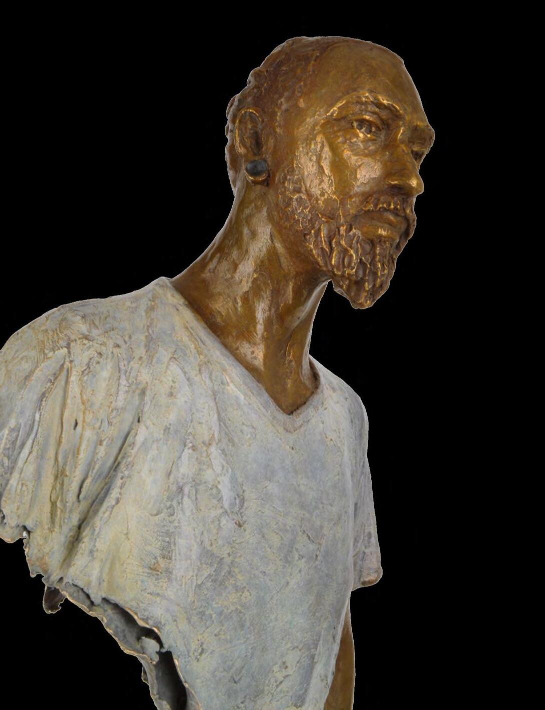 As an artist of travellers, Bruno Catalano makes a stopover from face to face for the duration of a sculpture, seeking to capture in each of his models the singular baggage that he carries with him. The series that has become emblematic and that he continues to work on today. The series that has become emblematic and that he continues to work on today began in 1995 as the resolution of a family epic and the new beginning of an artistic adventure. When he was born in Morocco in 1960, he was already the fruit of various journeys. His family, of Franco-Italian origin, had Jewish ancestors who had been expelled from Spain in the 15th century and taken refuge in Sicily before settling in North Africa. He was ten years old when they left the country to settle in Marseille. Then, trained by his father as an electrician, he began his professional life at the age of twenty by working on boats for a shipping company, then joined the SNCM. He is still far from art, but this experience will remain a determining factor in the construction of his sensitivity. It was with friends that he first discovered the craft of leather masks, then he devoted himself to clay from 1991. Determined to master this material, he enrolled in a modelling and drawing workshop, and completed his self-taught training by reading. Step by step, Bruno Catalano set up his own workshop, acquired his own kiln, and finally made sculpture his main activity. It gained official recognition when, in 2001, the town hall of the 5th arrondissement of Marseille entrusted him with the execution of a bust of Yves Montand to decorate the square dedicated to him. He thus inaugurated a production of public works of art which will become the heart of his work.