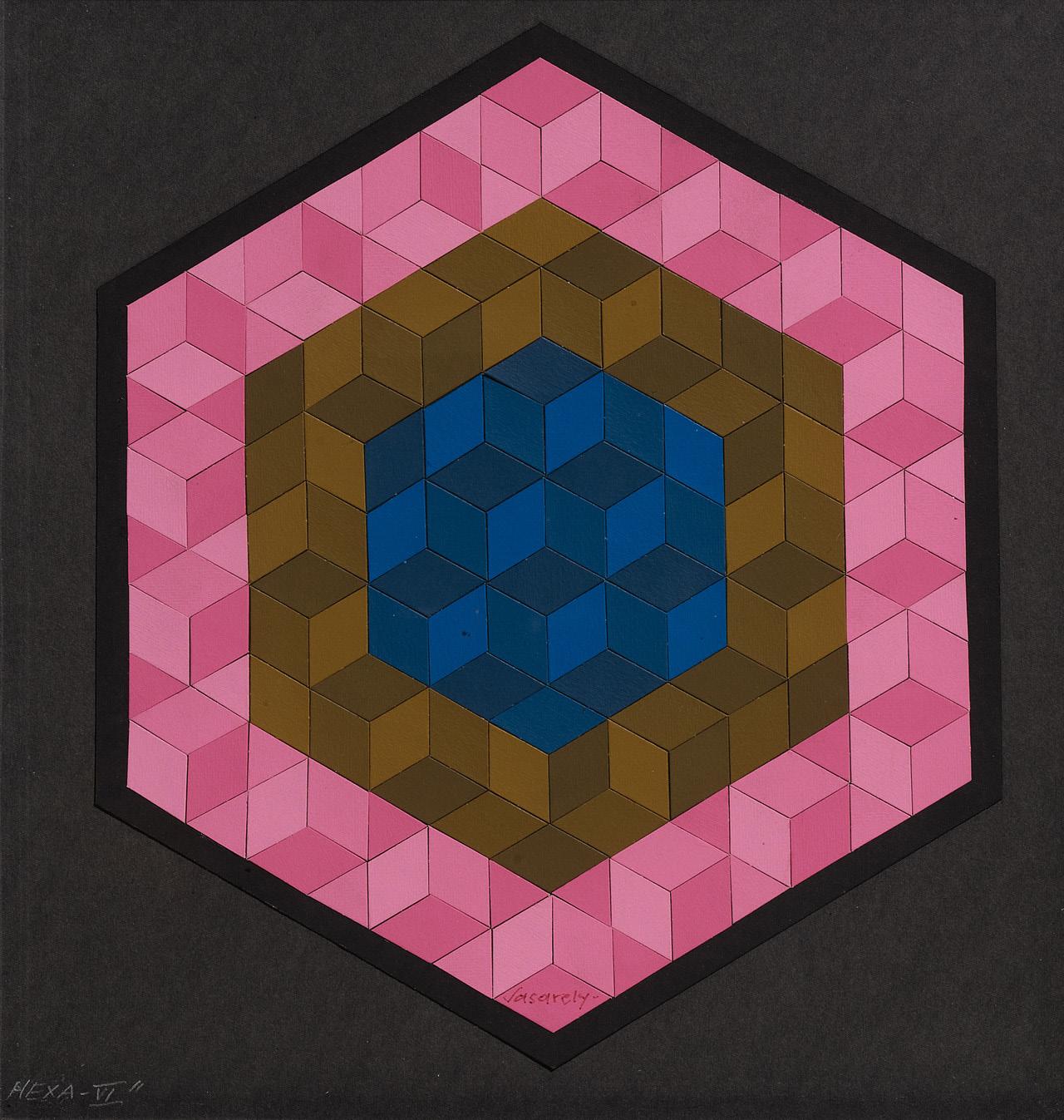 Né en Hongrie en 1908 sous le nom de Vásárely Gyözö, Victor Vasarely est largement considéré comme l’initiateur de l’Op art, un style basé sur l’illusion d’optique. Débutant sa carrière à Paris en 1930 dans plusieurs agences de publicité pour soutenir son travail dans les arts graphiques, il commence à développer sa signature abstraite après le succès de sa première exposition personnelle en 1944. Très influencé par les abstractionnistes géométriques tels que Kazimir Malevitch et Piet Mondrian, Victor Vasarely maîtrise l’utilisation des effets optiques et de l’illusion par le biais de la couleur et des formes géométriques.