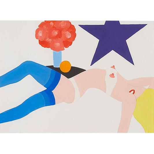 Tom Wesselmann, one of the first figures of American pop art, was originally destined to become a cartoonist. Born in Ohio in 1931, he initially studied psychology. Shortly after graduating from the University of Cincinnati, he moved to New York to study art at the Cooper Union. His early works were small collages and assemblages, first using discarded paper and old advertisements, then incorporating found objects, such as utensils or even old TV sets. His first major series, “Great American Nude”, begun in 1961, attracted the attention of the art world. Featuring aggressively sexualized and highly depersonalized female figures in mundane surroundings, the compositions focus on sensual details, such as women’s mouths, nipples and genitals. This series illustrates Tom Wesselmann’s place as one of the initiators of American Pop Art; the use of bright, undiluted colors and impersonal, advertising-like motifs are all hallmarks of this movement.