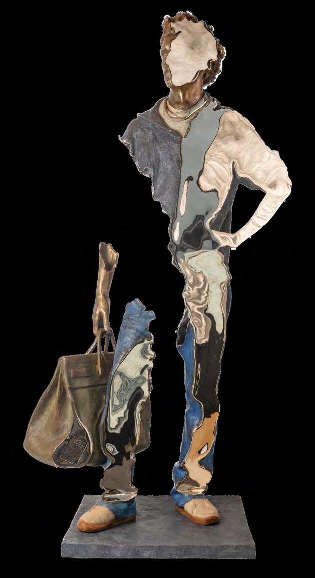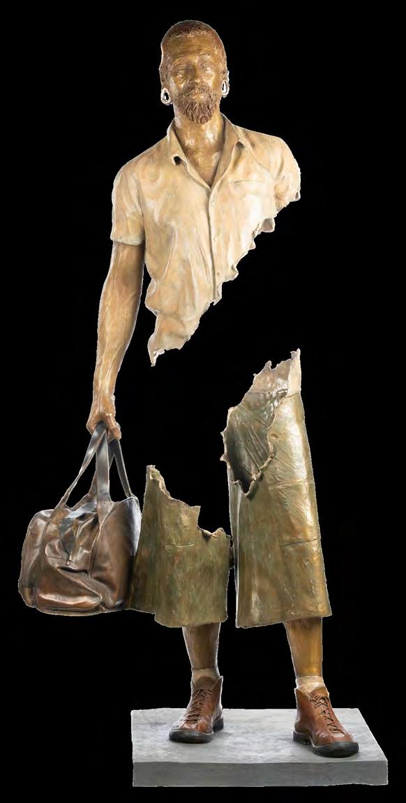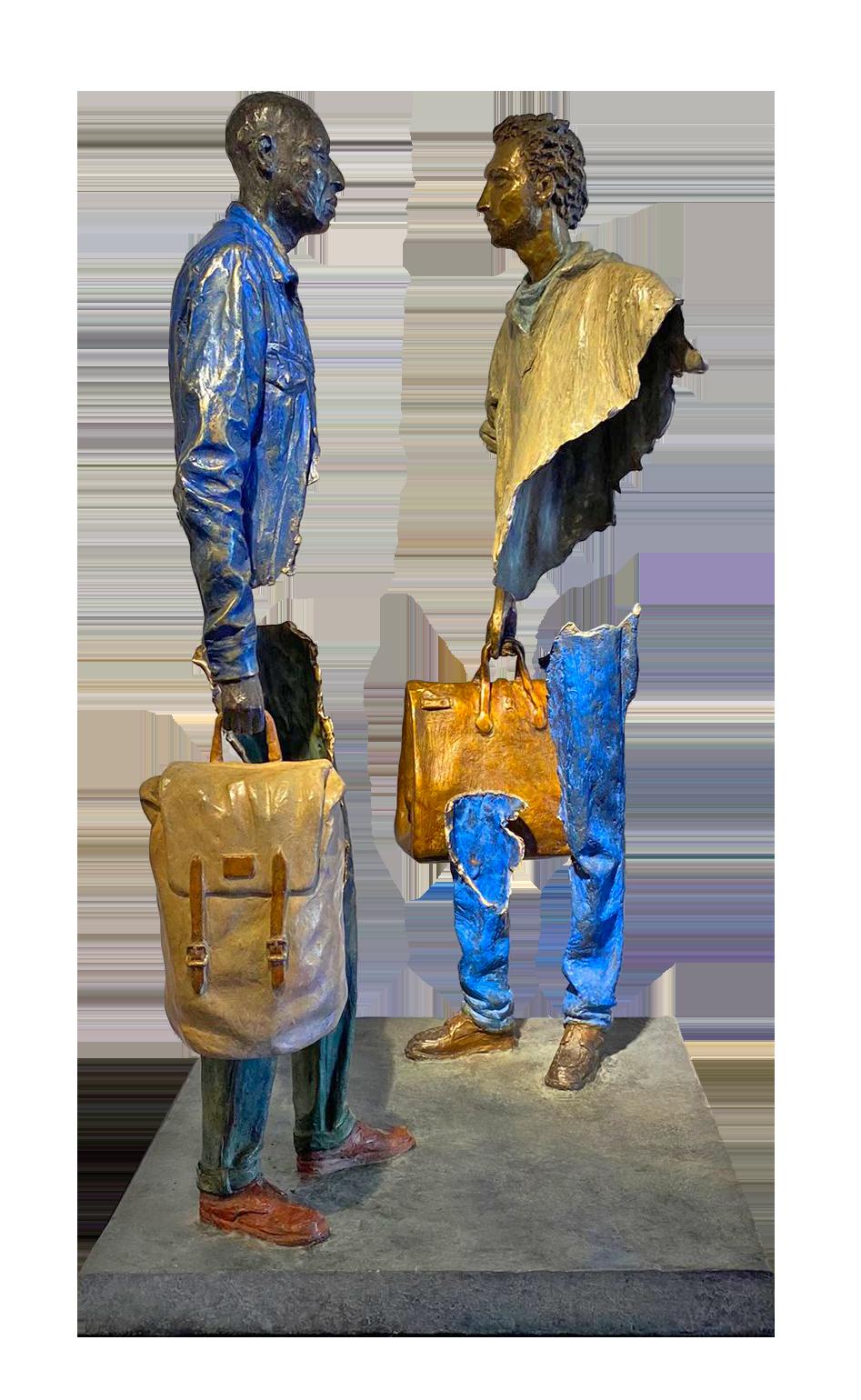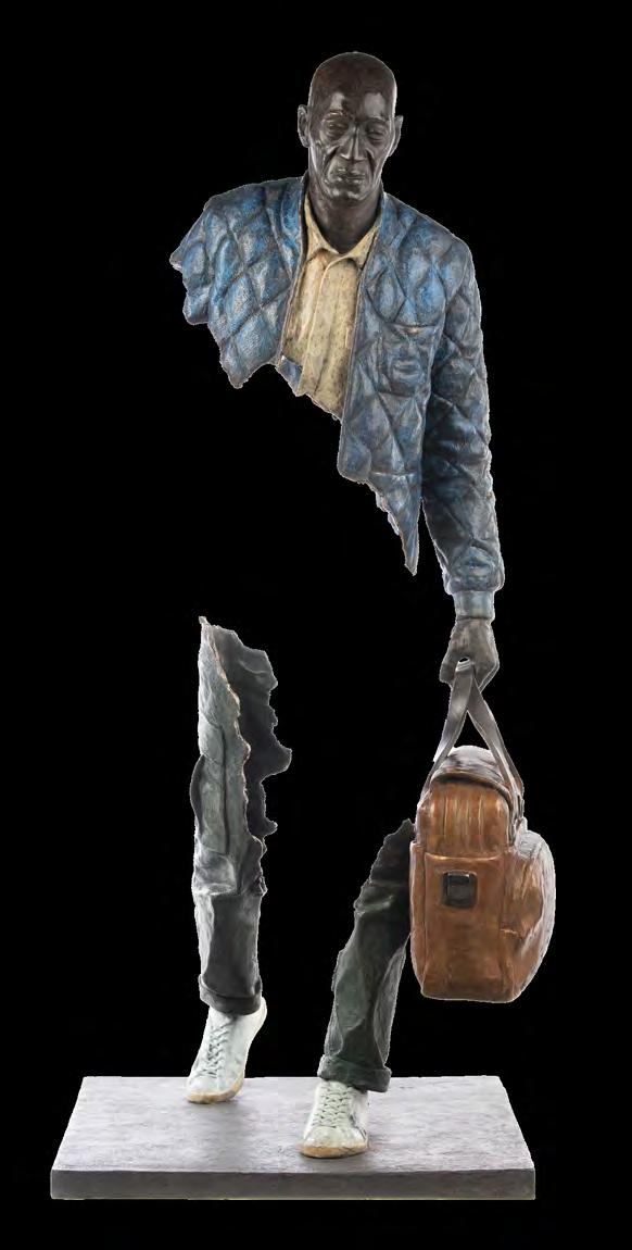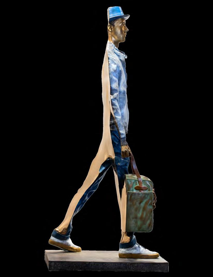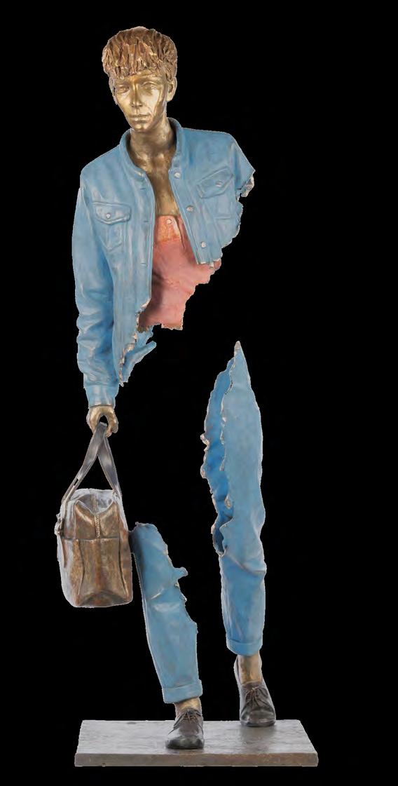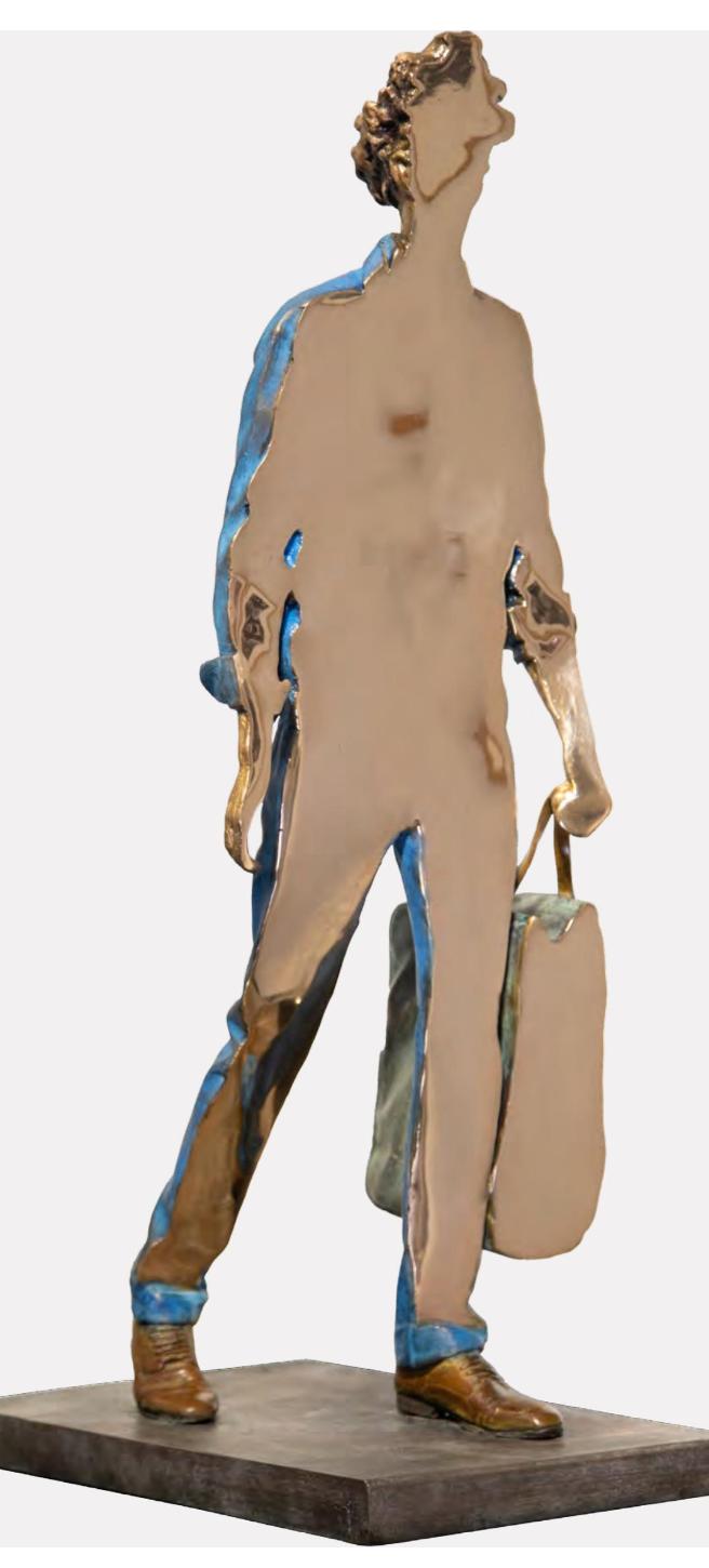 Traditionally, Western sculpture has a longstanding relationship with the nude, Bruno Catalano’s ‘Travellers’ distinguish themselves as dressed in contemporary garments, highlighted and enhanced by patina. This authentic wardrobe is made up of simple, often timeworn clothes. Their folds reveal the stories and trajectories of the characters: their ordinary appearance becomes heroic.