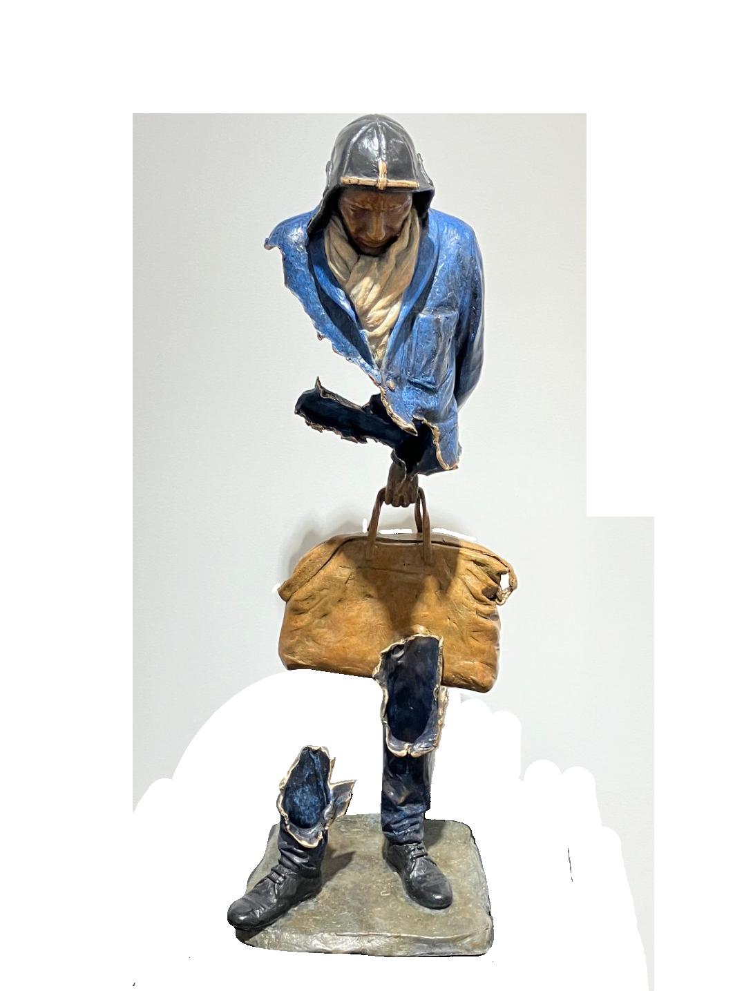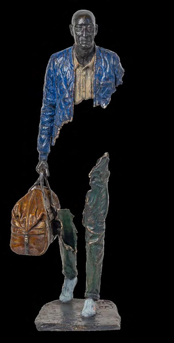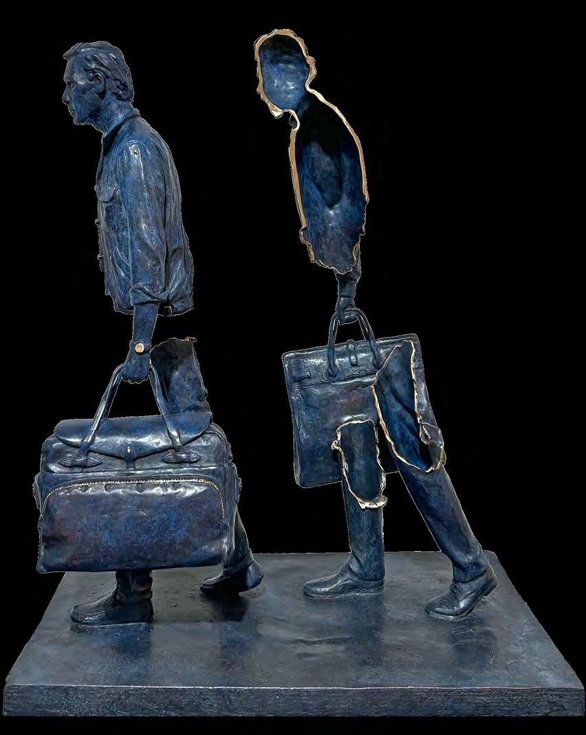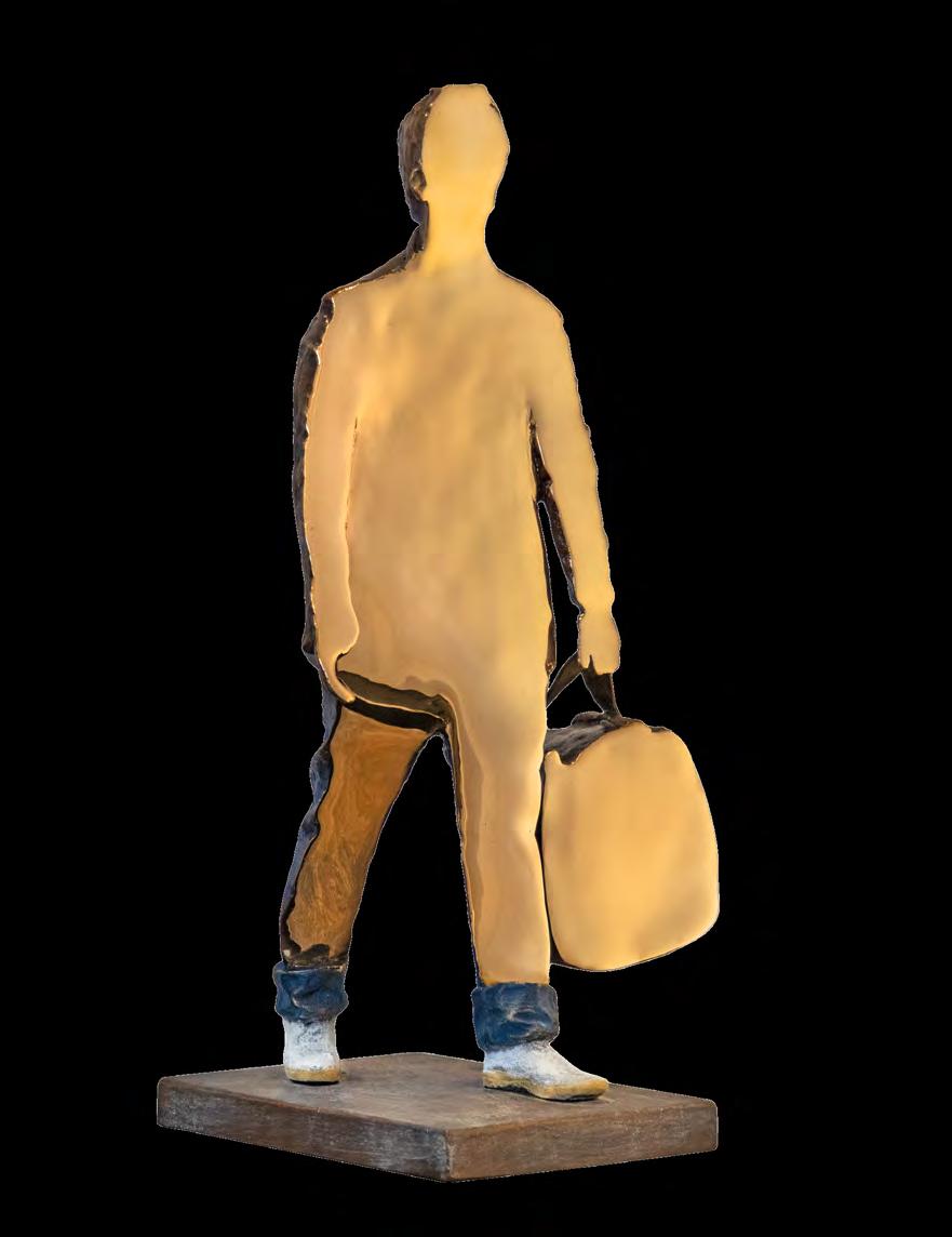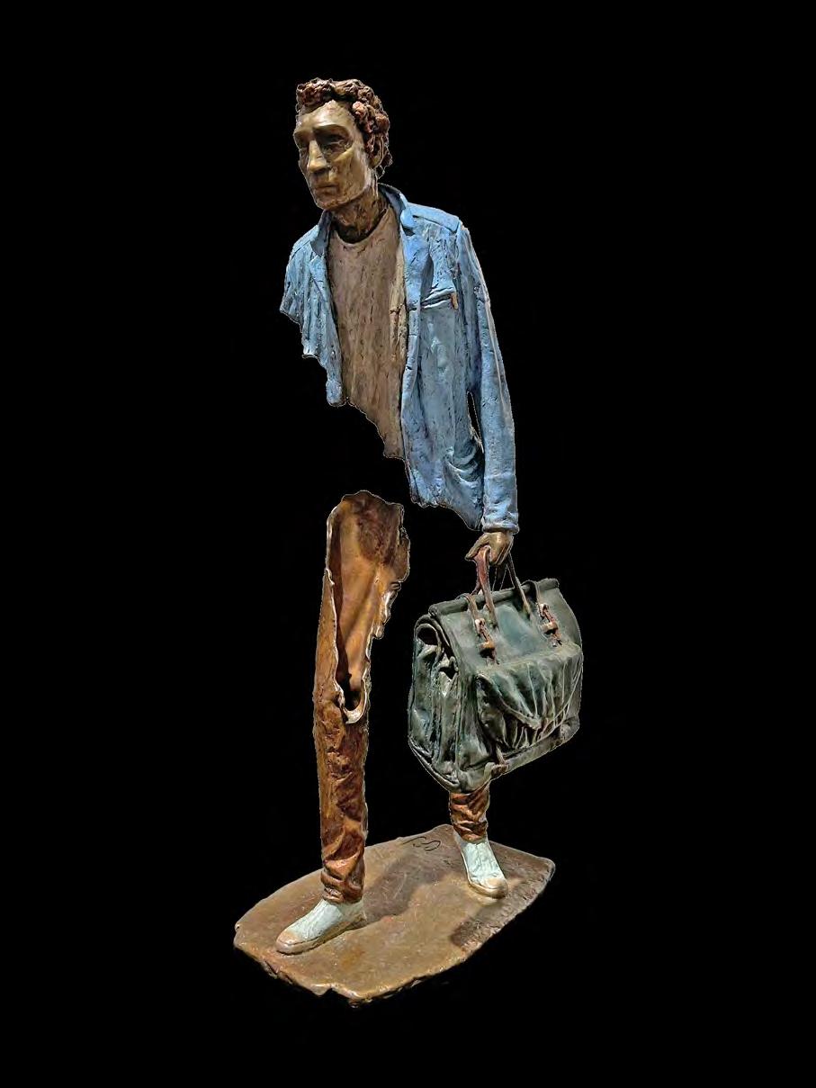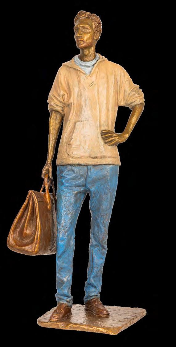Traditionally, Western sculpture has a longstanding relationship with the nude, Bruno Catalano’s ‘Travellers’ distinguish themselves as dressed in contemporary garments, highlighted and enhanced by patina. This authentic wardrobe is made up of simple, often timeworn clothes. Their folds reveal the stories and trajectories of the characters: their ordinary appearance becomes heroic.