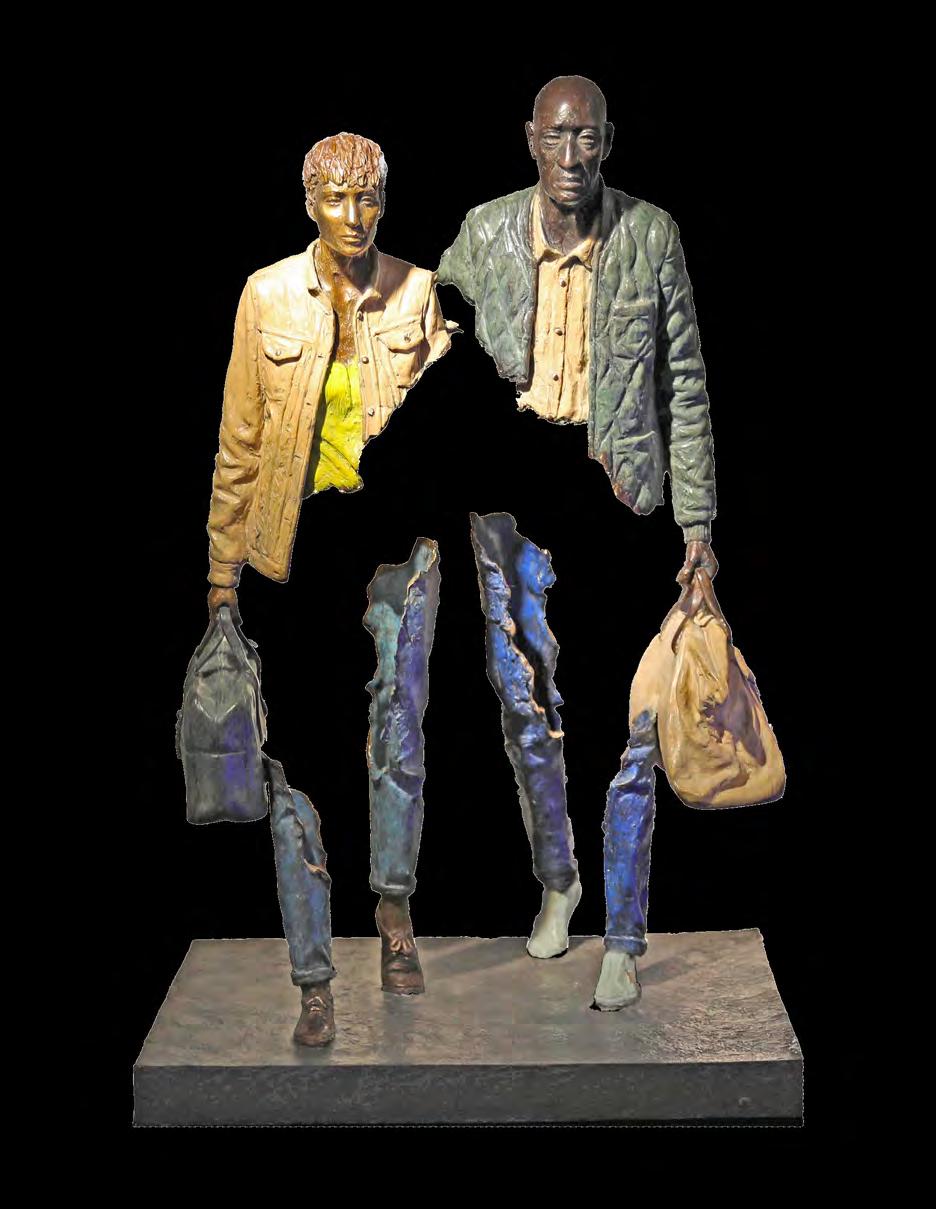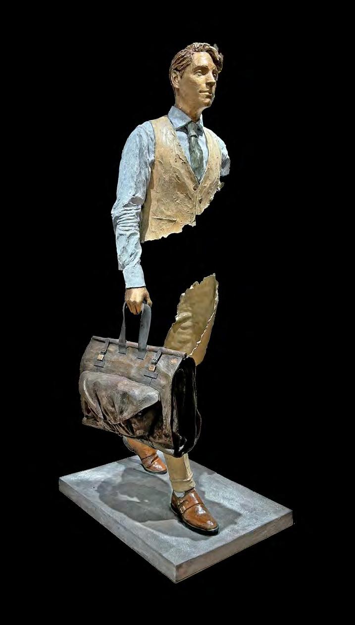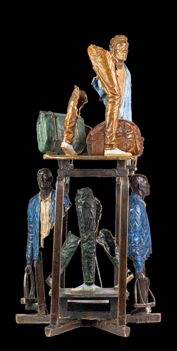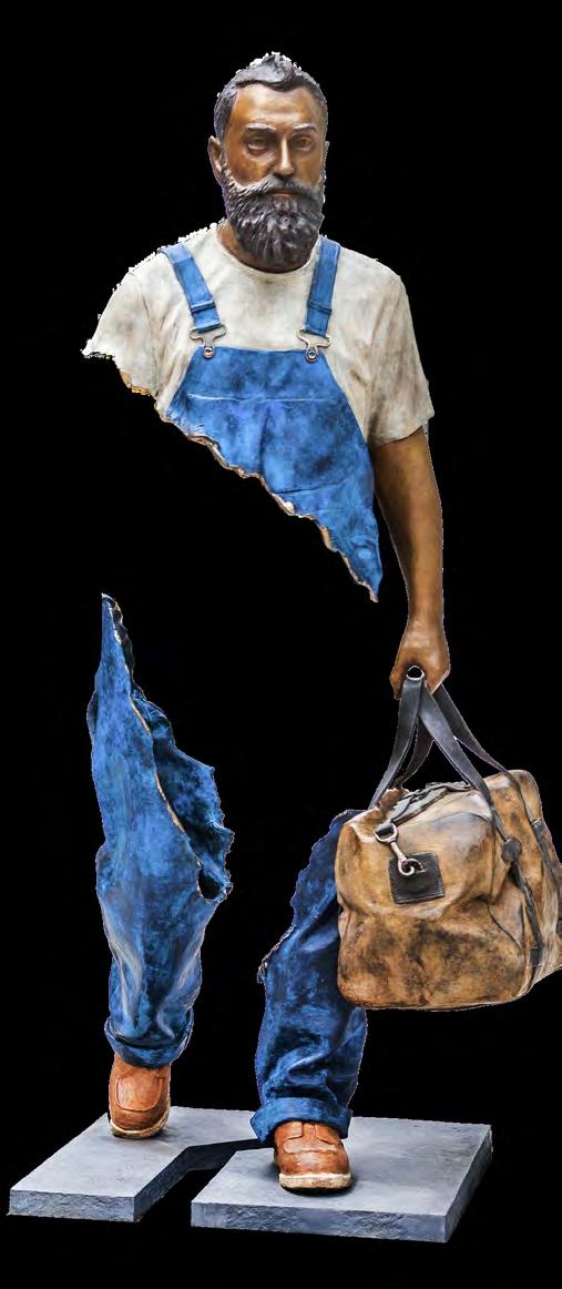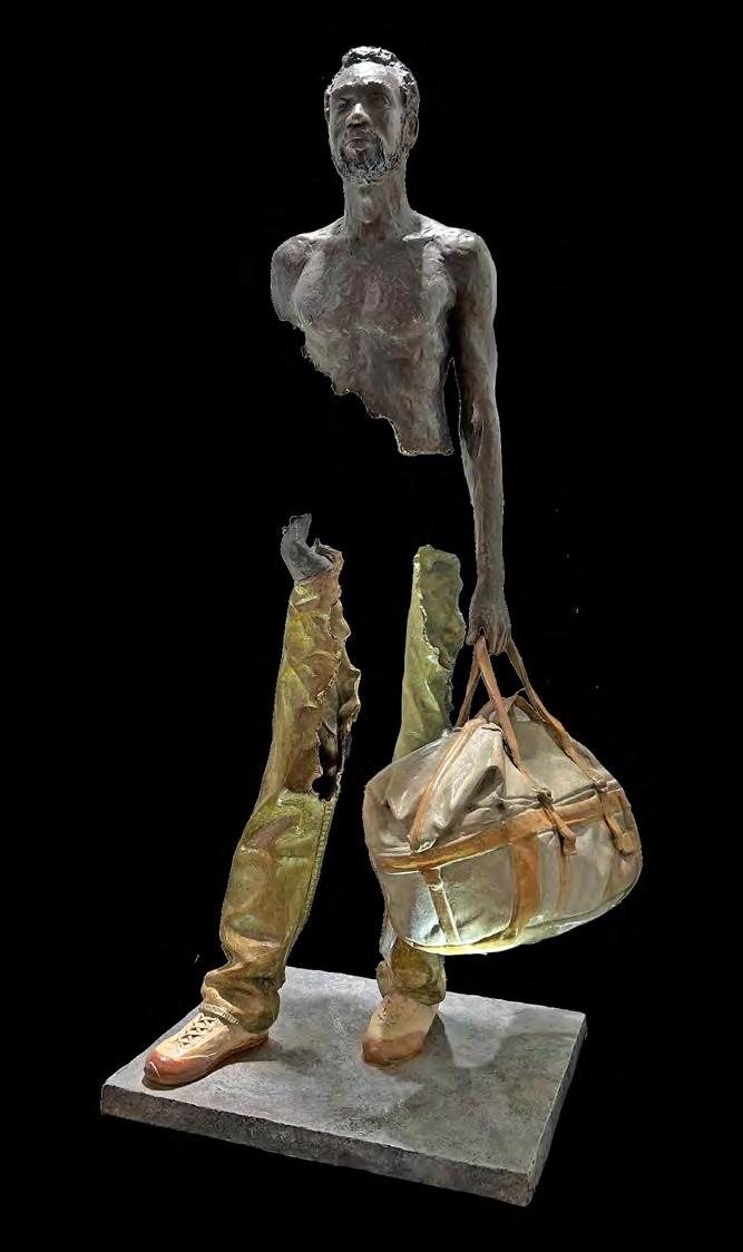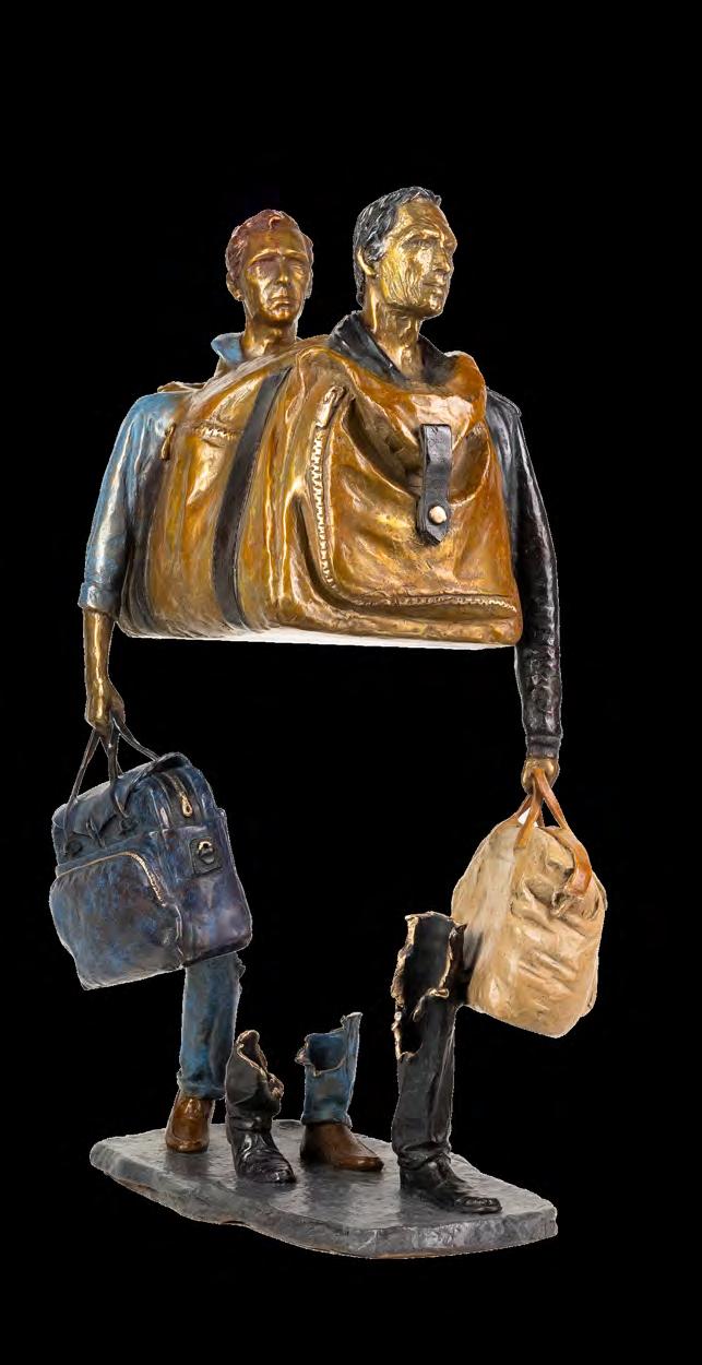 Traditionally, Western sculpture has a longstanding relationship with the nude, Bruno Catalano’s ‘Travellers’ distinguish themselves as dressed in contemporary garments, highlighted and enhanced by patina. This authentic wardrobe is made up of simple, often timeworn clothes. Their folds reveal the stories and trajectories of the characters: their ordinary appearance becomes heroic.