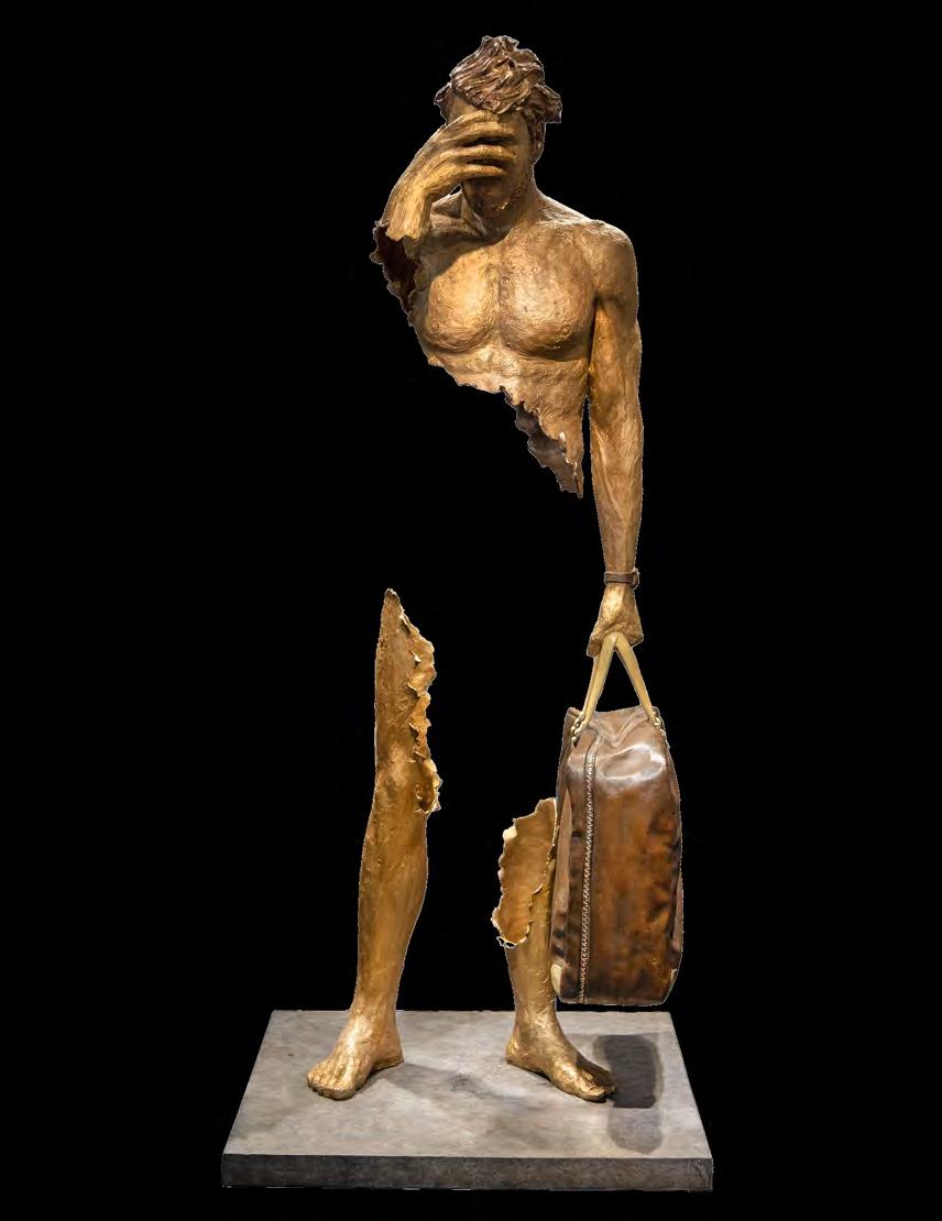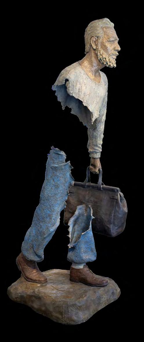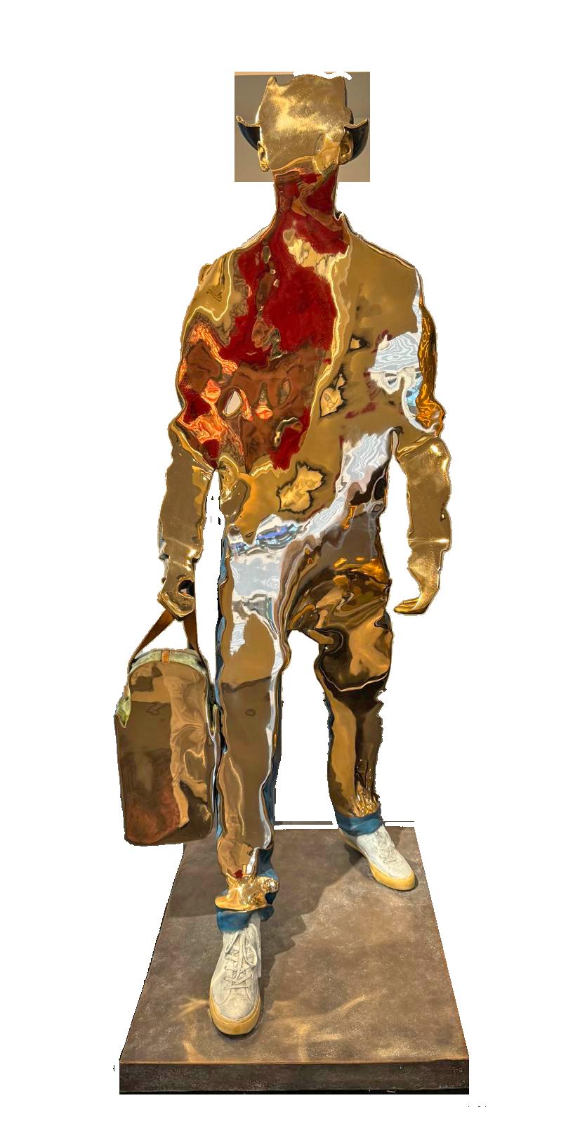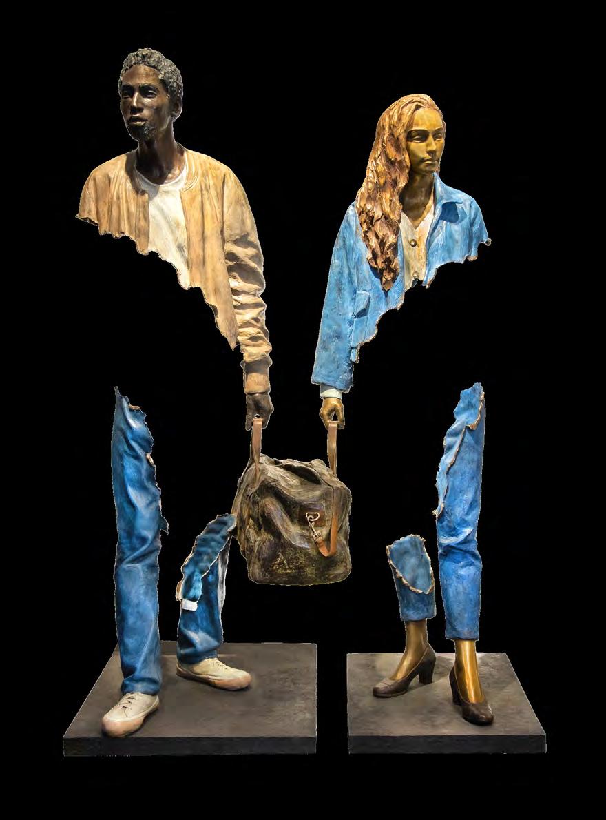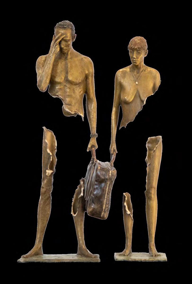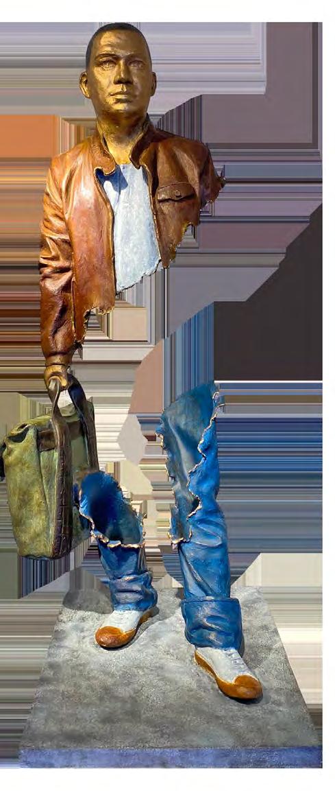 Traditionally, Western sculpture has a longstanding relationship with the nude, Bruno Catalano’s ‘Travellers’ distinguish themselves as dressed in contemporary garments, highlighted and enhanced by patina. This authentic wardrobe is made up of simple, often timeworn clothes. Their folds reveal the stories and trajectories of the characters: their ordinary appearance becomes heroic.