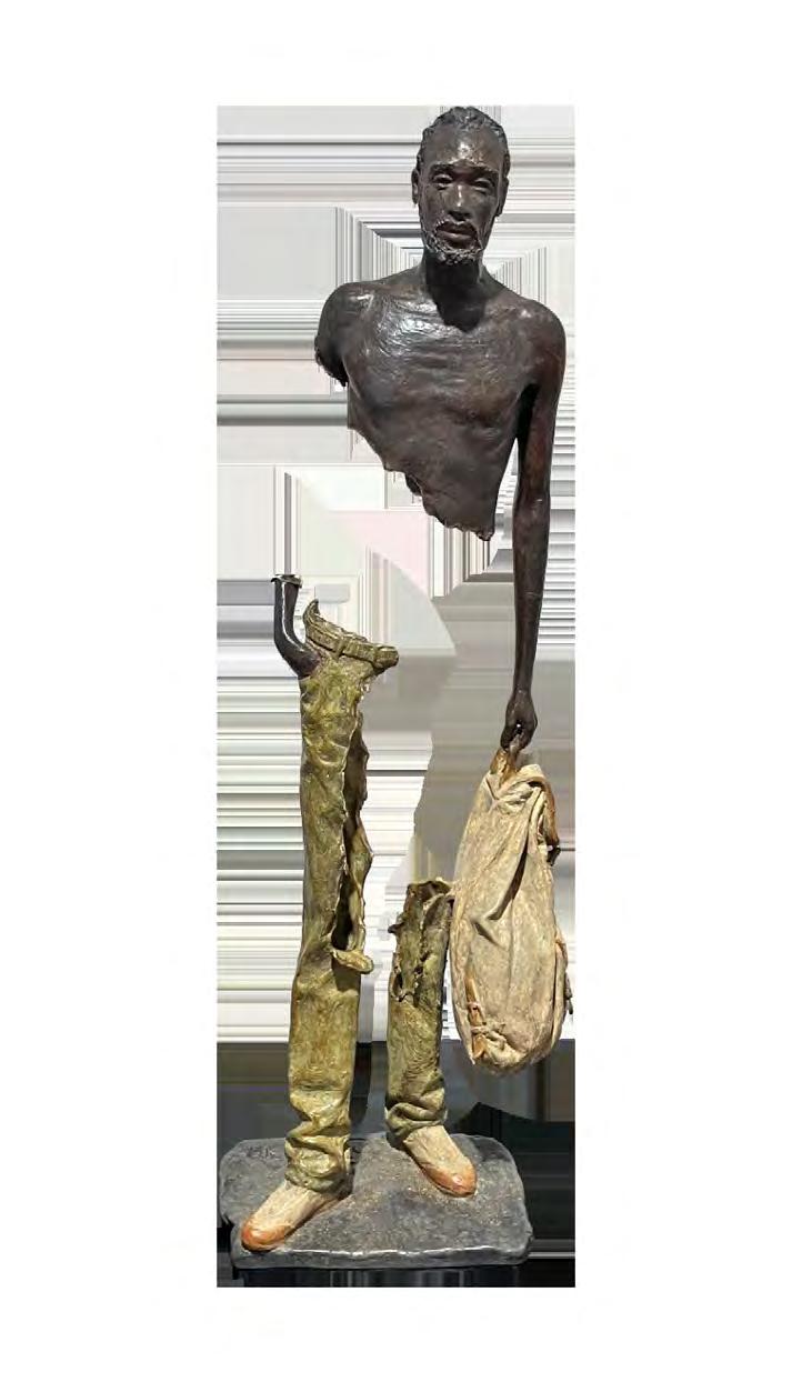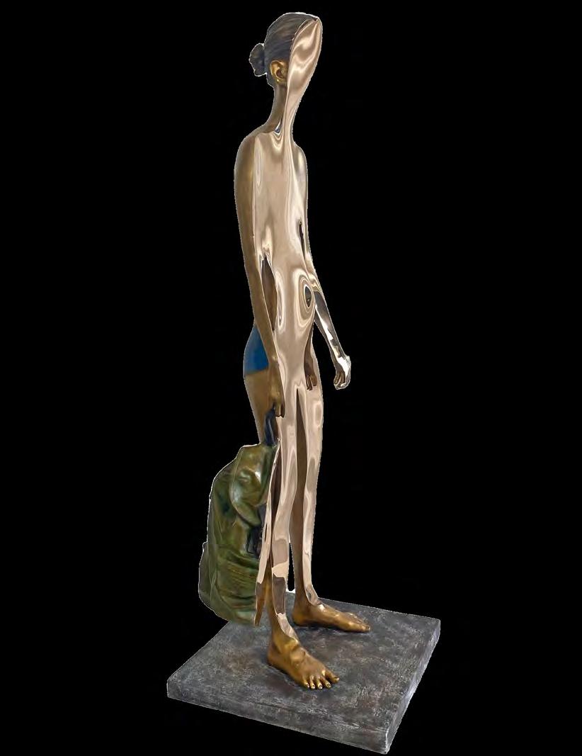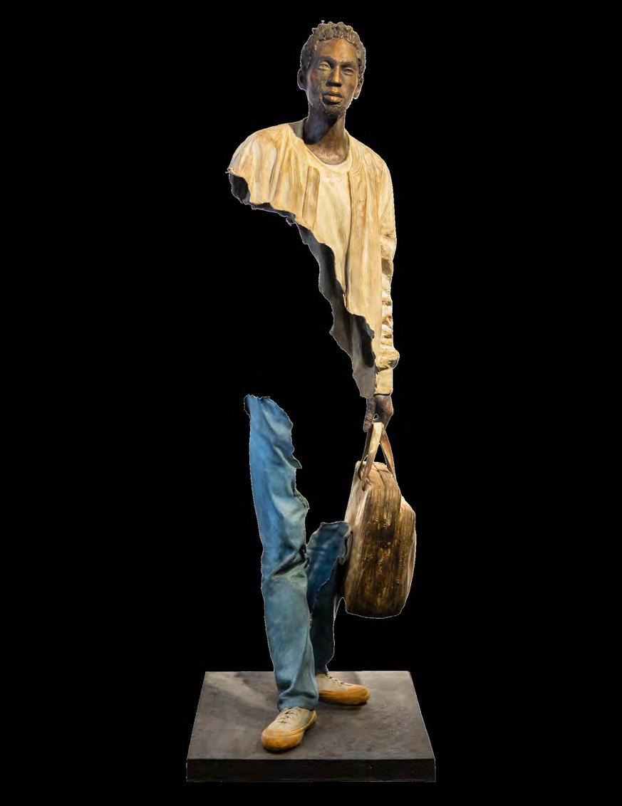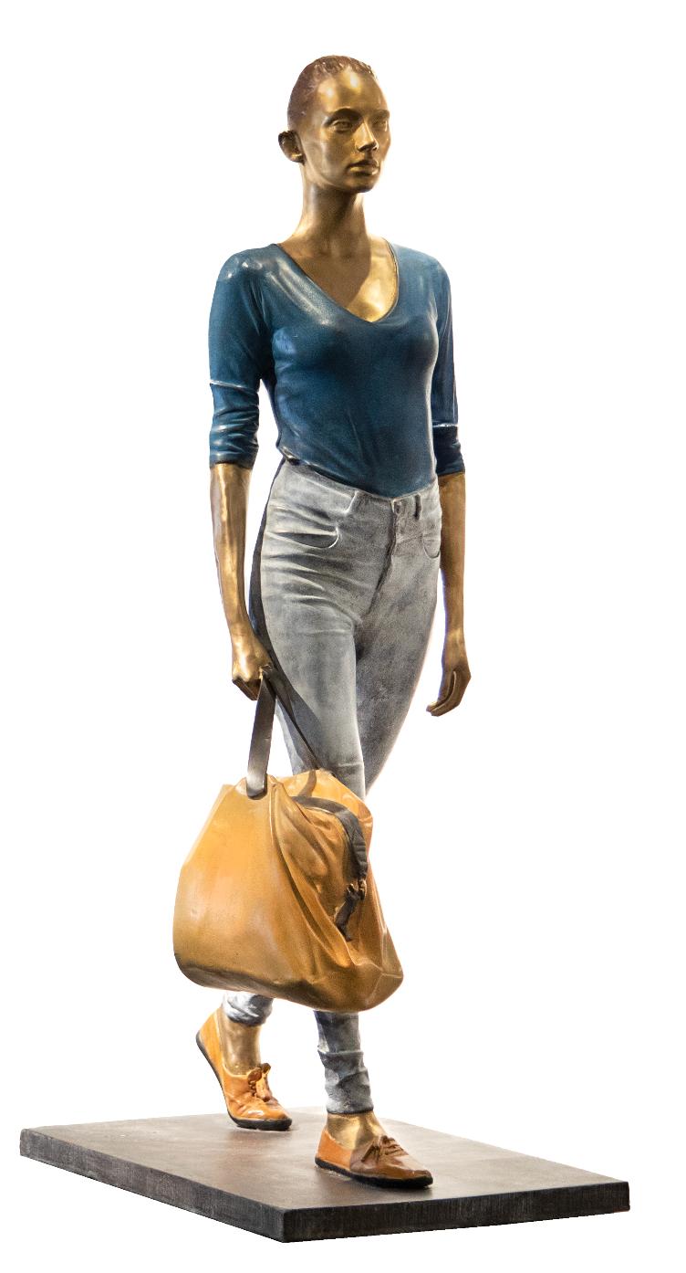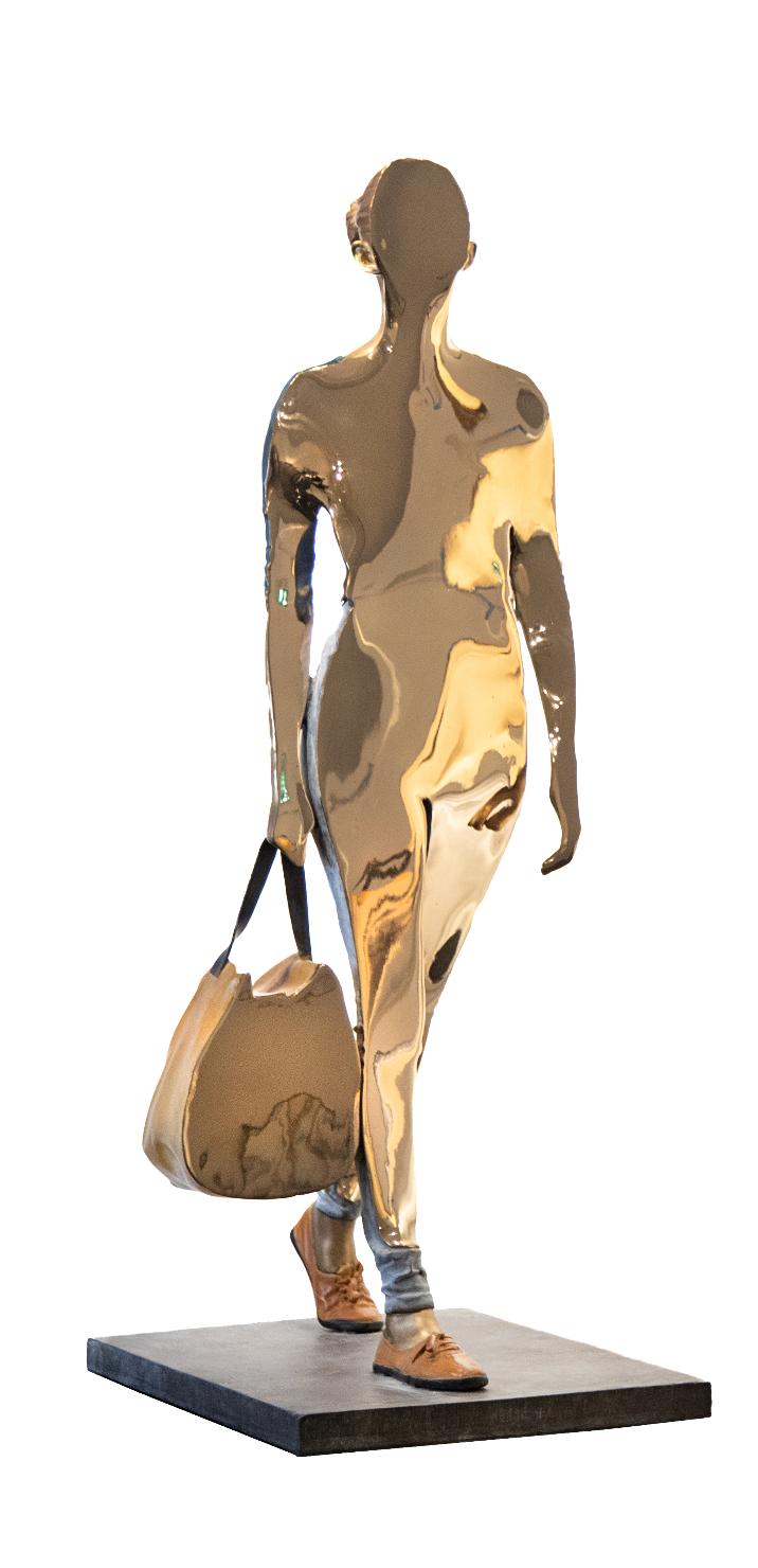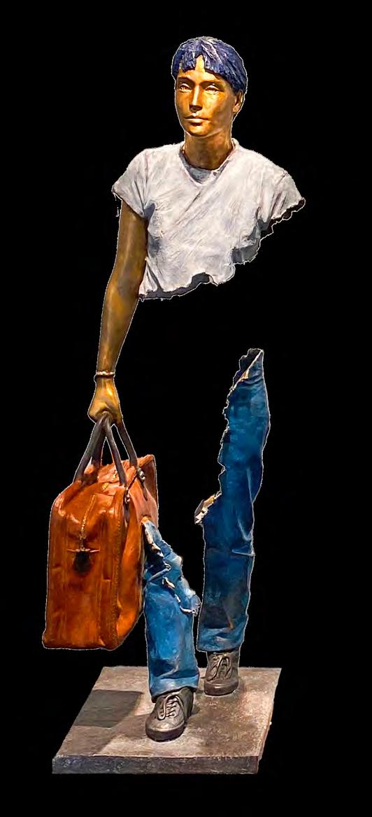 Traditionally, Western sculpture has a longstanding relationship with the nude, Bruno Catalano’s ‘Travellers’ distinguish themselves as dressed in contemporary garments, highlighted and enhanced by patina. This authentic wardrobe is made up of simple, often timeworn clothes. Their folds reveal the stories and trajectories of the characters: their ordinary appearance becomes heroic.