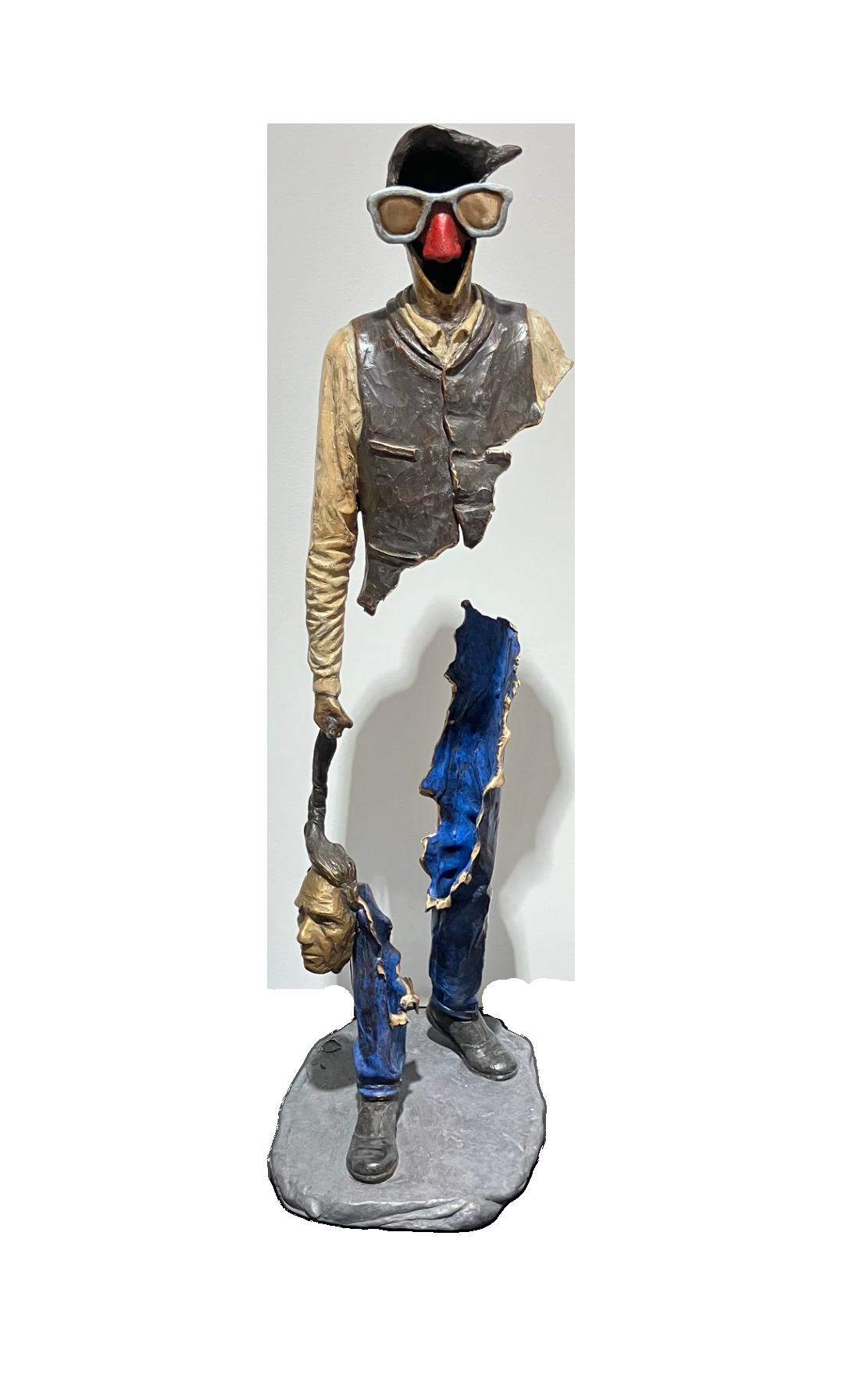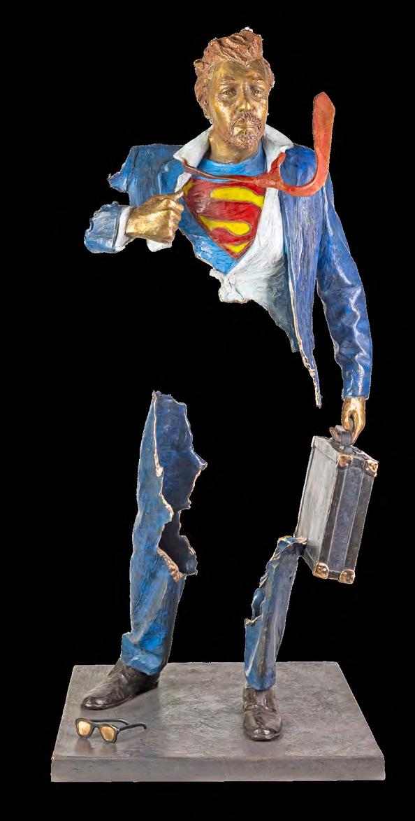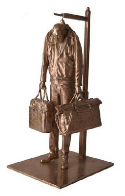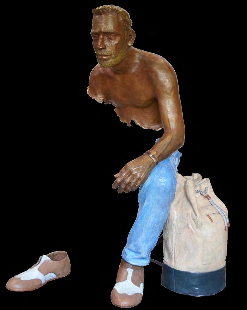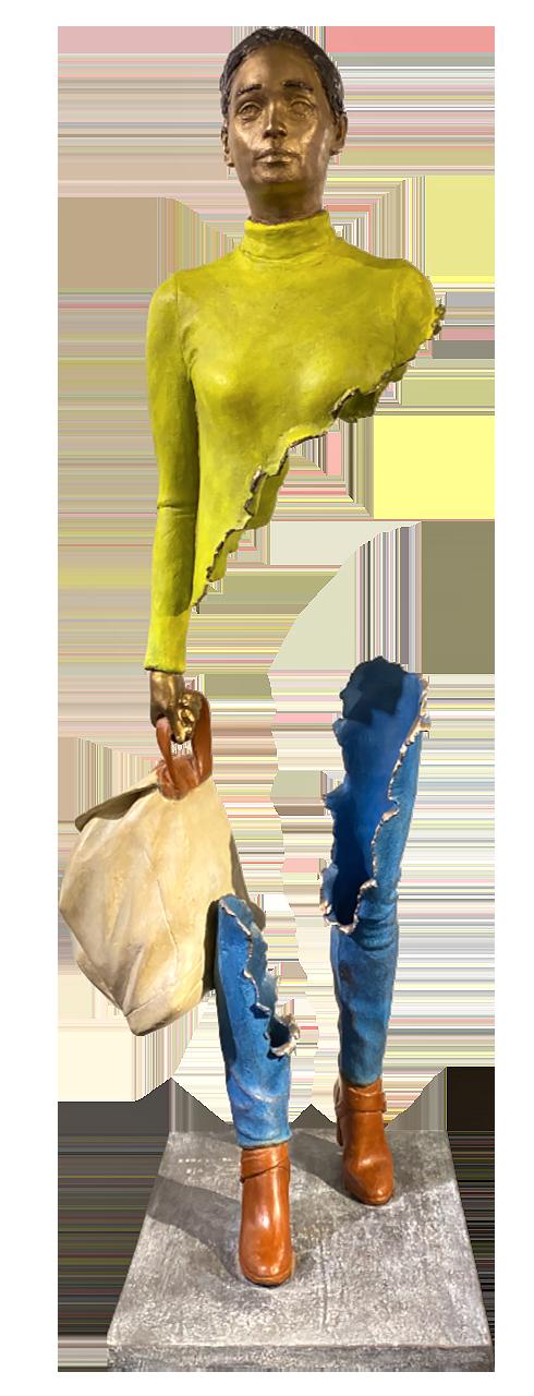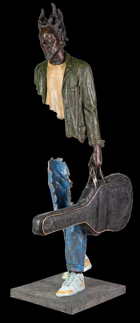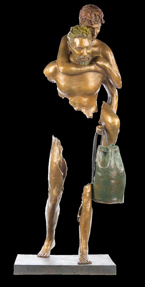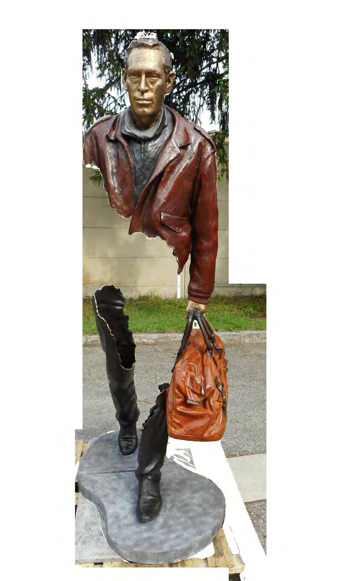 Traditionally, Western sculpture has a longstanding relationship with the nude, Bruno Catalano’s ‘Travellers’ distinguish themselves as dressed in contemporary garments, highlighted and enhanced by patina. This authentic wardrobe is made up of simple, often timeworn clothes. Their folds reveal the stories and trajectories of the characters: their ordinary appearance becomes heroic.