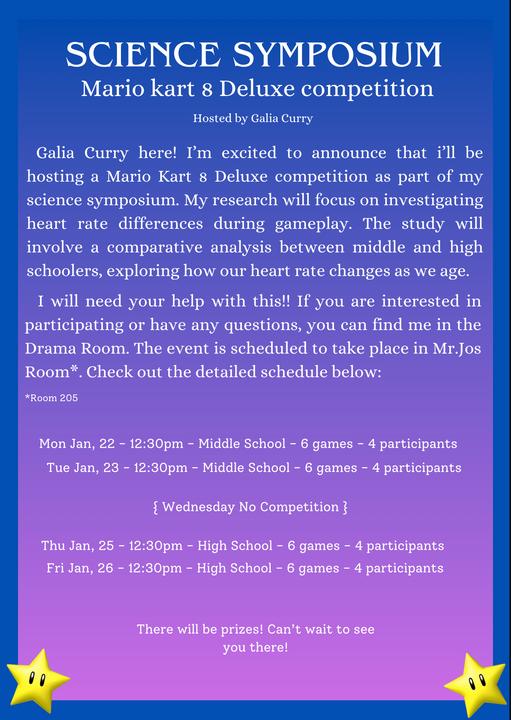 Cluster sampling, groups rather than individual units of the target population are selected at random for the sample. These might be pre-existing groups, such as students belonging to an academic year (Webster, n.d). Cluster sampling facilitated the determination of the specific demographic groups for sampling purposes. The selected groups for the study comprised middle and high school students To encourage participant involvement in the research, I strategically distributed posters throughout the school premises and informational announcements, detailing a research competition (See Figure 4). This serves as self-selection bias as individuals are allowed to choose whether they want to participate in this research study Middle school students were designated for participation on Mondays and Tuesdays, while high school students were scheduled on Thursdays and Fridays all scheduled during the lunchtime period, spanning from 12:15 PM to 1:15 PM in a designated classroom. The trial, held from January 22 to 26, comprised a cohort of 16 participants This group consisted of 8 middle school students and 8 high school students, evenly distributed with 4 participants for each day of the trial.