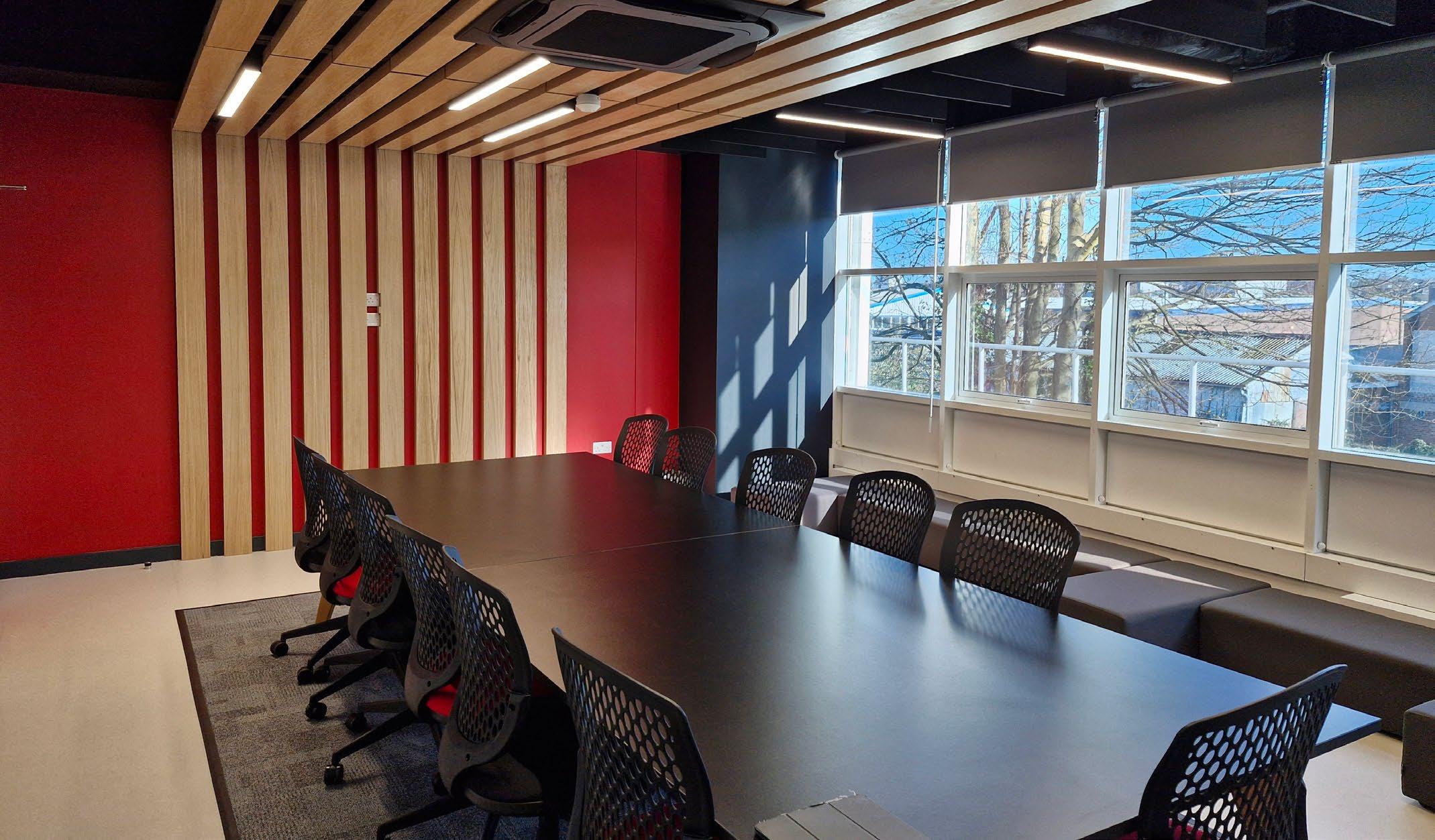 Throughout the building, acoustic panels and real wood finishes, such as ash veneer doors and warm timber furniture, contribute to a welcoming and comfortable environment.