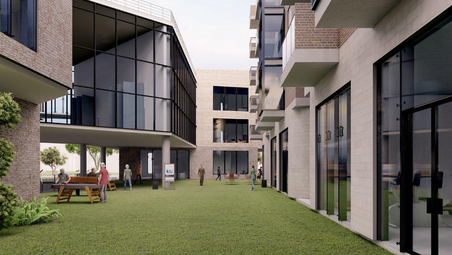 The design features four buildings across two halves of the site, accommodating 850 bed spaces. The development includes rentable ground-floor spaces, a light industrial workspace, and a landscaped avenue.