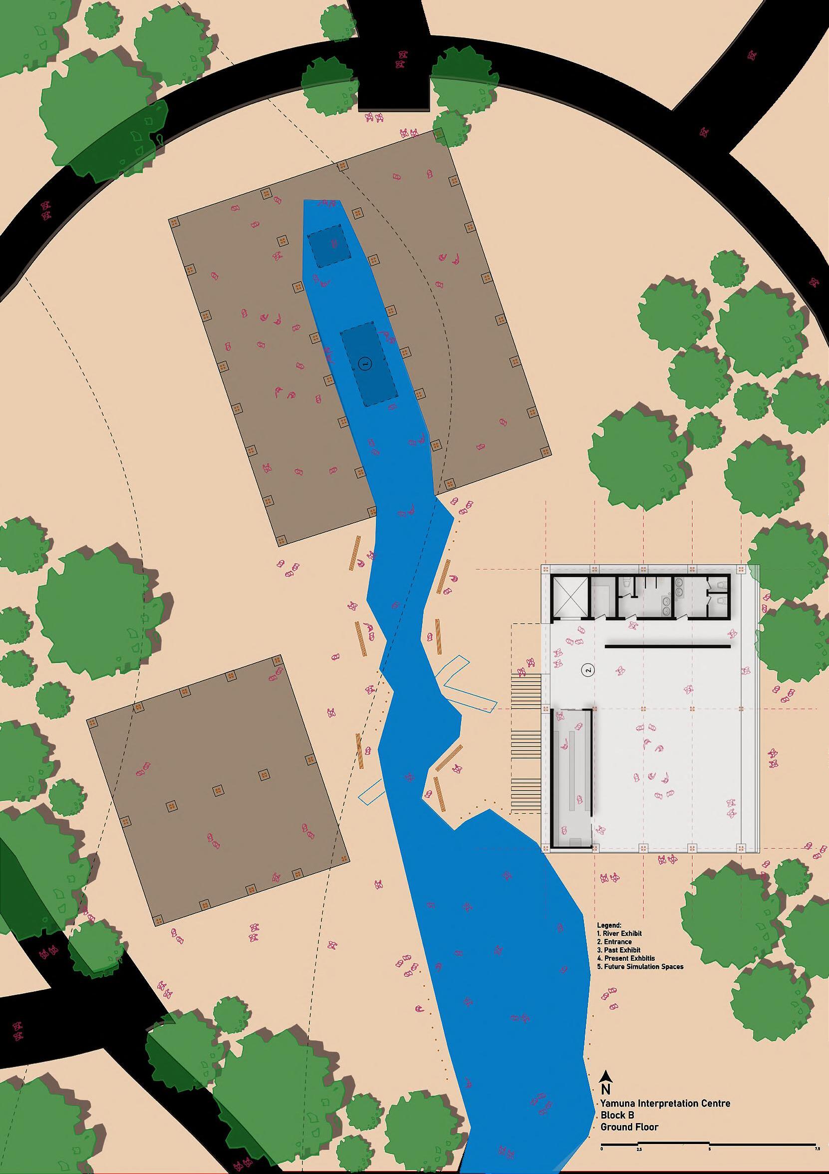 The main exhibit of the design is a scaled down, active Yamuna River.