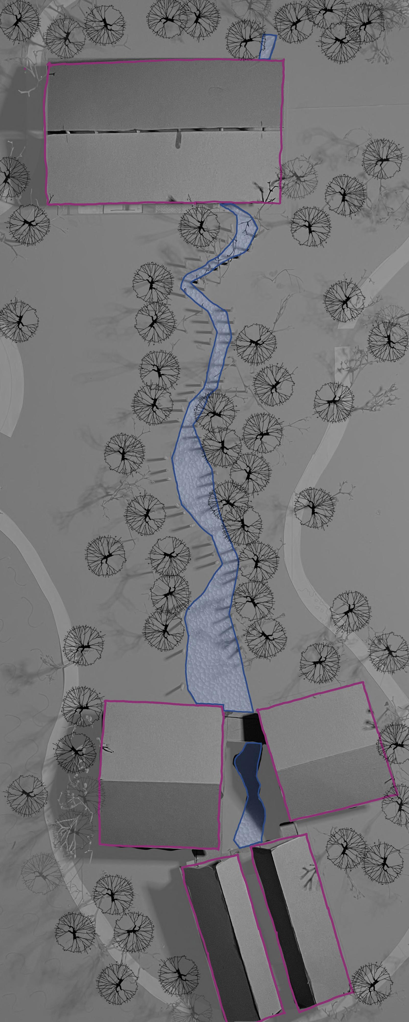 The first exhibit, ‘The River,’ is a metaphorical, ankle-deep installation connecting the built forms on site.