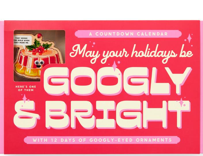 • 12 unique googly-eyed ornaments, each hidden behind a perforated door.