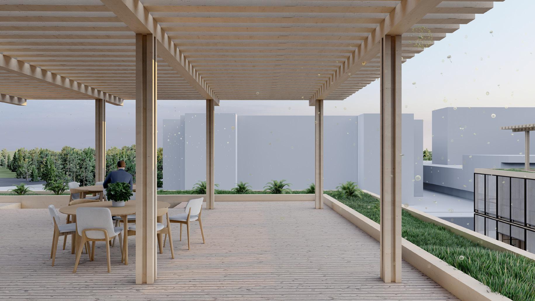 La planta baja es un espacio que se puede recorer ya que cuenta con una sucesión de locales de distintos usos flexibles. Su acceso desde ella son por las caras norte y sur, la circulación vertical remata en una terraza con una pergola y un espacio al aire libre con posibilidad de espacio común para los usuarios del complejo de viviendas. Con respecto a la circulacion horizontal y la llegada a cada vivienda, es un pasillo semicubierto y en la planta baja esa circulacion permite el paseo por esos locales mencionados anteriormente, en un espacio que vincula en interior y el exterior dando asi una continuidad en el terreno que no tienen las siguientes.