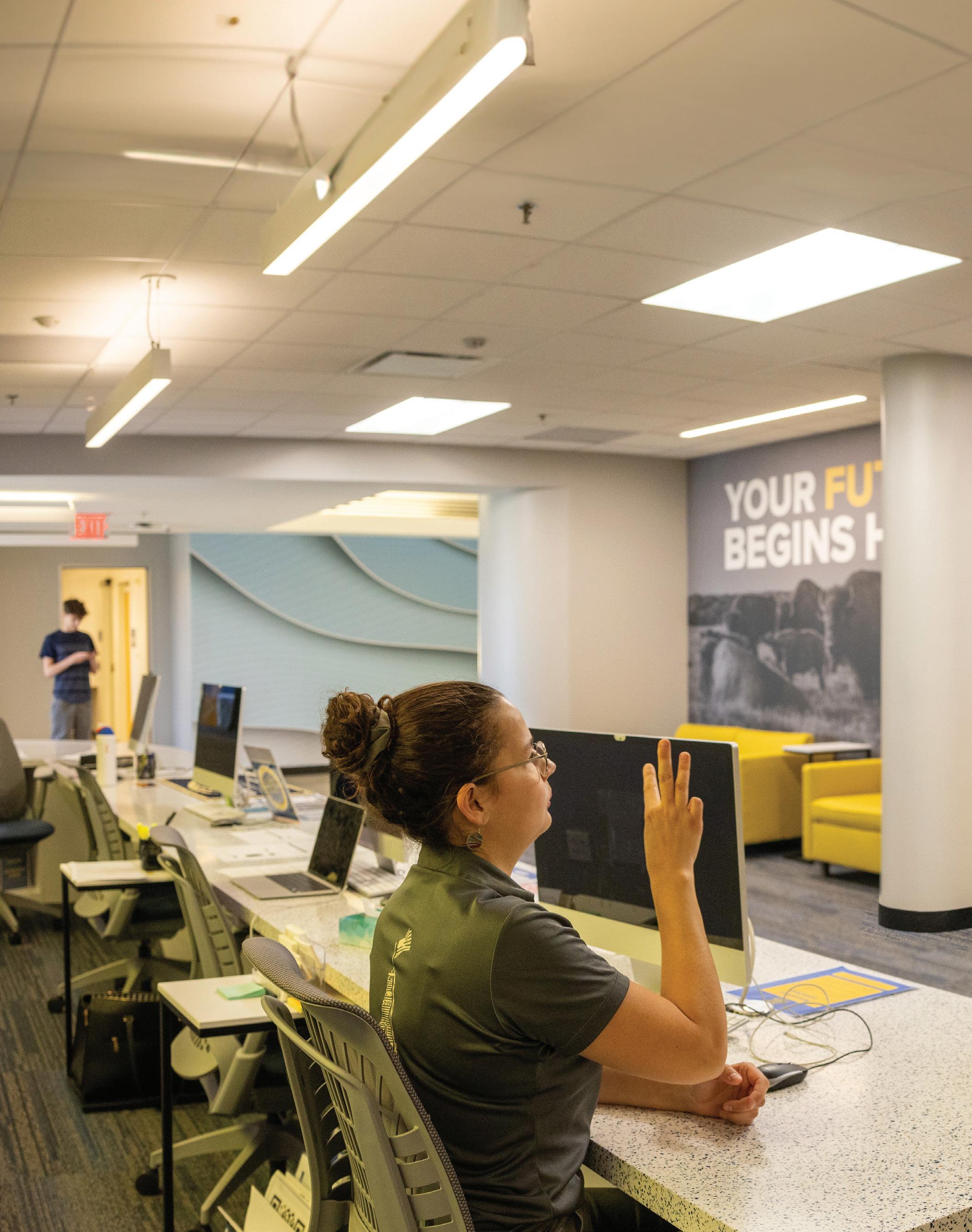 In less than one year, the new Esports Arena in Ely Center has become the most popular hangout on campus. The 1,850-square foot space, formerly a computer laboratory for the Department of Business and a storage area, has been upgraded to accommodate the latest in gaming technology while incorporating Deaf Space principles. The space is now filled with thrilling, energetic LED light strips and a vibrant, cozy gaming vibe.
