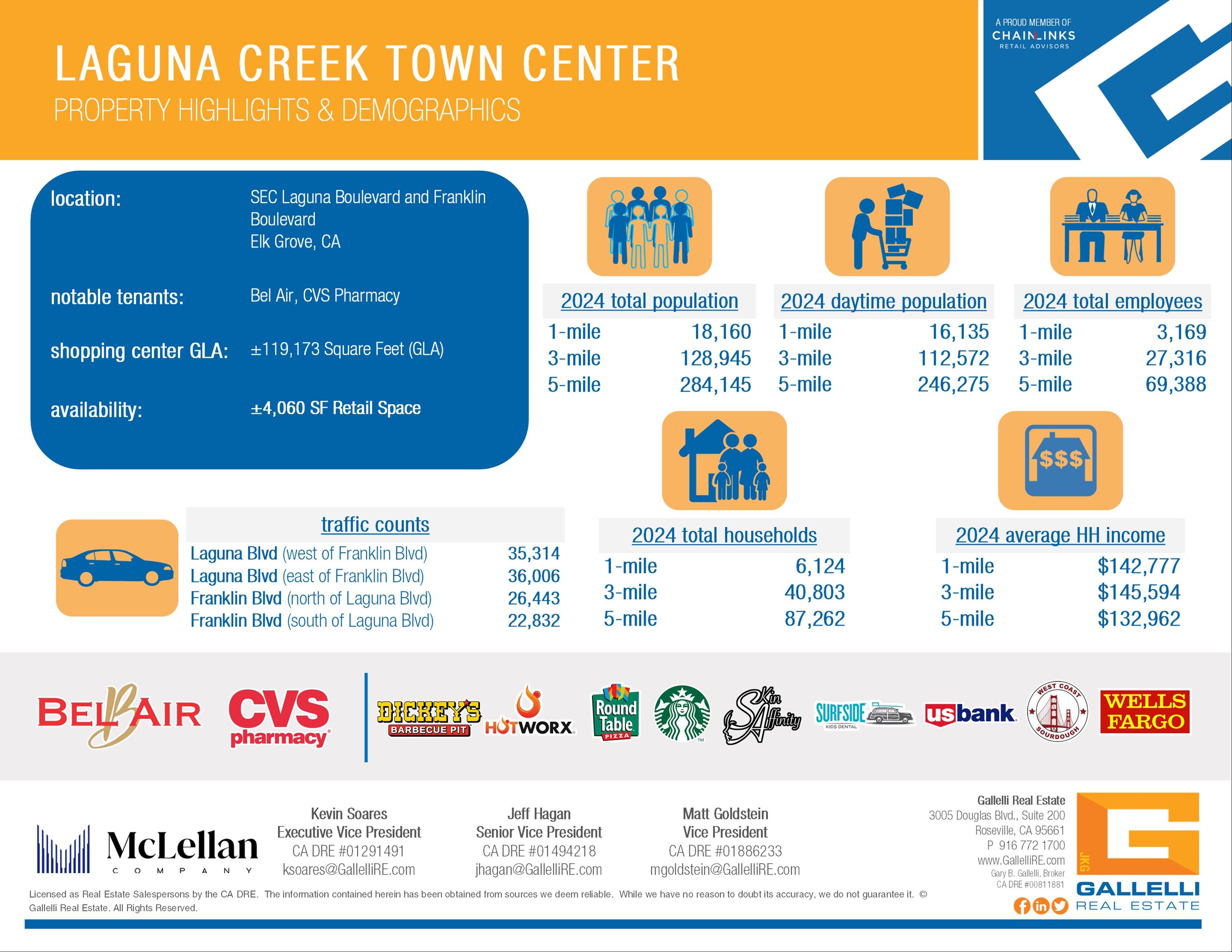 Ideally situated in the northwest portion of the East Franklin Specific Plan, the center draws from both western Elk Grove and the Laguna sub-trade areas. The center serves an excellent demographic profile that boasts an average household income of $171,577 in a 1-mile radius.