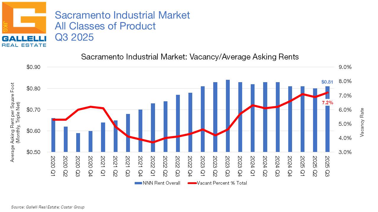 Industrial vacancy in the Sacramento region jumped in Q3 2025 from 6.9% to 7.2%. While the market recorded occupancy growth, the 2,000 square feet (SF) of positive net absorption posted this quarter was negligible. Meanwhile, developers added 527,000 SF of new speculative space, and that disparity between supply (new development) and demand (net absorption) translated into an uptick in vacancy.