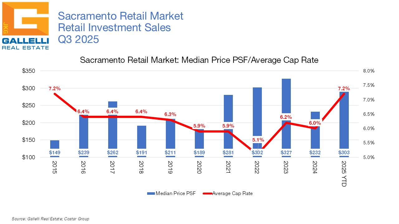 Meanwhile, developers added 168,000 SF of new space to market in Q3 and there was an additional 180,000 SF under construction as this report went to press. This includes a 95,000 SF shopping center in the Roseville/Rocklin submarket that will come online in Q4 2025 that will be anchored by a 43,000 SF Nugget grocery store in that town’s Whitney Ranch neighborhood. That project reportedly has leased, or is close to leasing, all its available space. This will mark the second new store for regional grocer Nugget this year. The Woodland-based elite grocer opened their 18th store in the region in August in a former Walmart Neighborhood site at the corner of Douglas Boulevard and Sierra College Boulevard in Roseville.