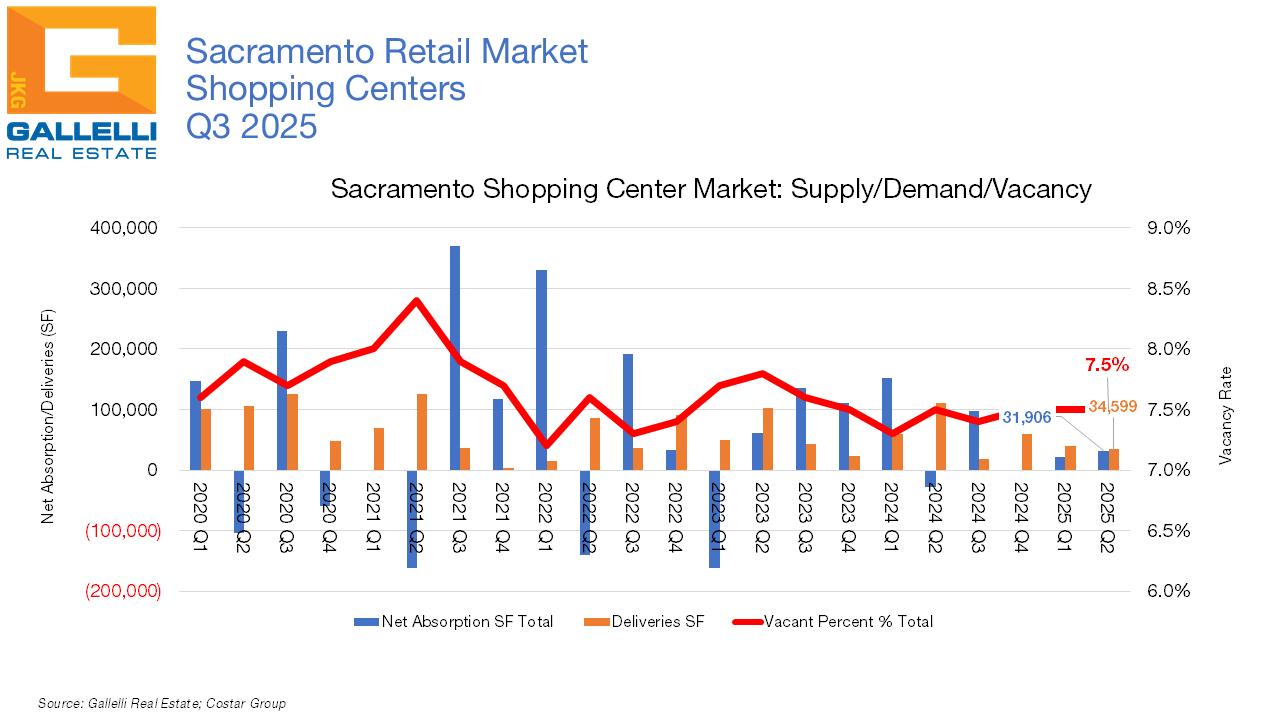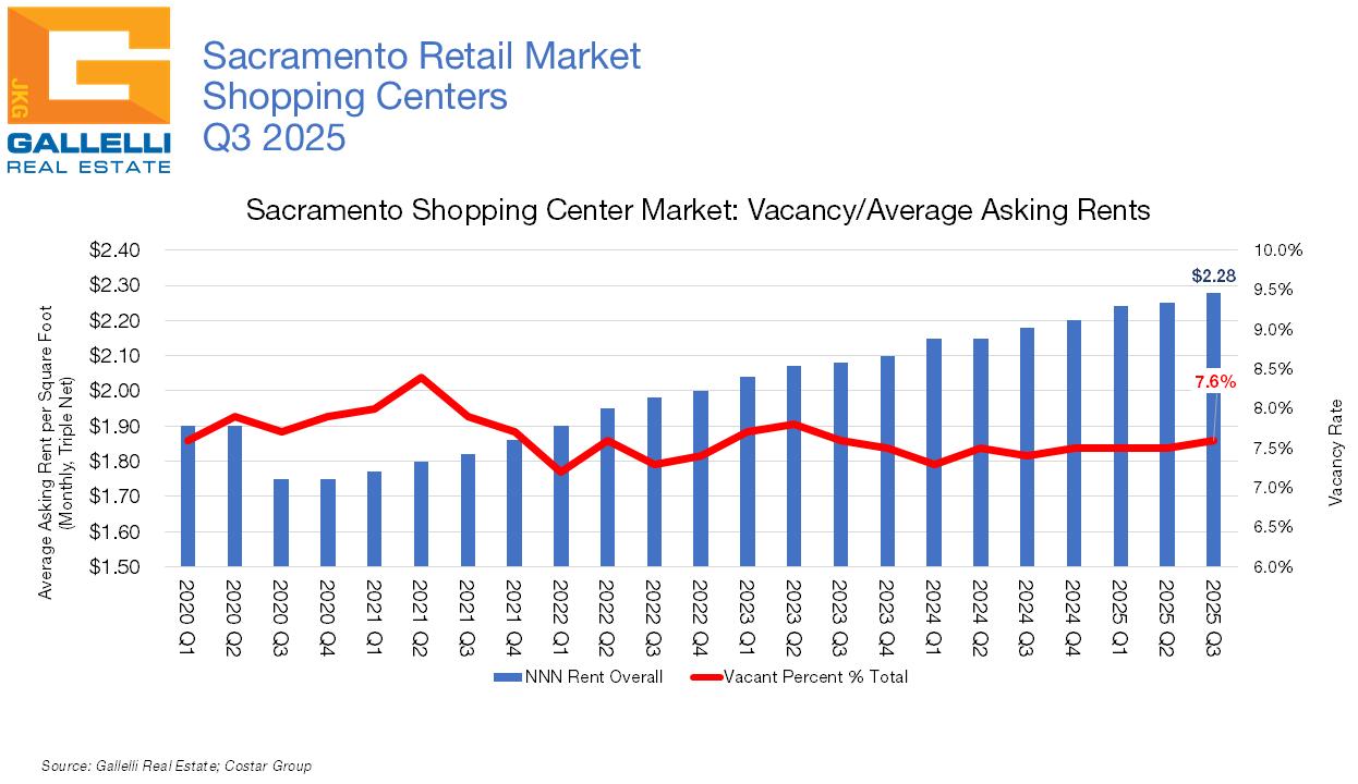Vacancy for shopping center space in the Sacramento region stood at 7.6% as of the end of Q3 2025, up slightly from last quarter’s reading of 7.5% and from the 7.4% rate that was in place exactly one year ago.