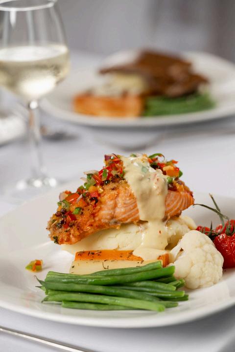 OvenbakedinaCrispyCrumbcoating,servedonMixed SaladLeaveswithCitrusAioli