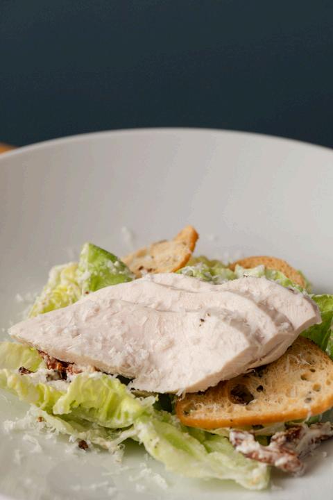 SmokedChickenSaladwithCrispyBacon,Lettuce, CroutonsandParmesanCheese,withaCreamyCaesar Dressing