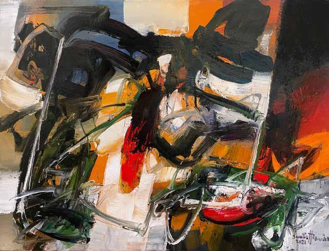 da lamine dorate e argentee, da ferite rosso/ sacrificio e da vibrazioni astratte, conducono îl pensiero verso una pulsante tensione non priva di intimi accenti e ormai lontani echi figurali, si da evocare îl ‘mistero’.