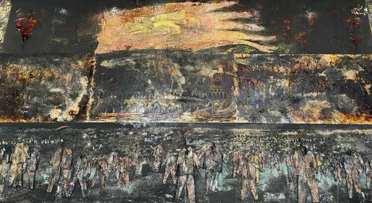 (…) Il suo linguaggio fortemente comunicativo è frutto di lunghi anni di studi ed esperienze artistiche interdisciplinari, e si esprime su tavole lignee e installazioni, realizzate con materiali non solo utilizzati al servizio della forma ma concettualmente impiegati come trasmettitori di memorie e simbologie. Legni antichi, garze, pergamena, papiro,