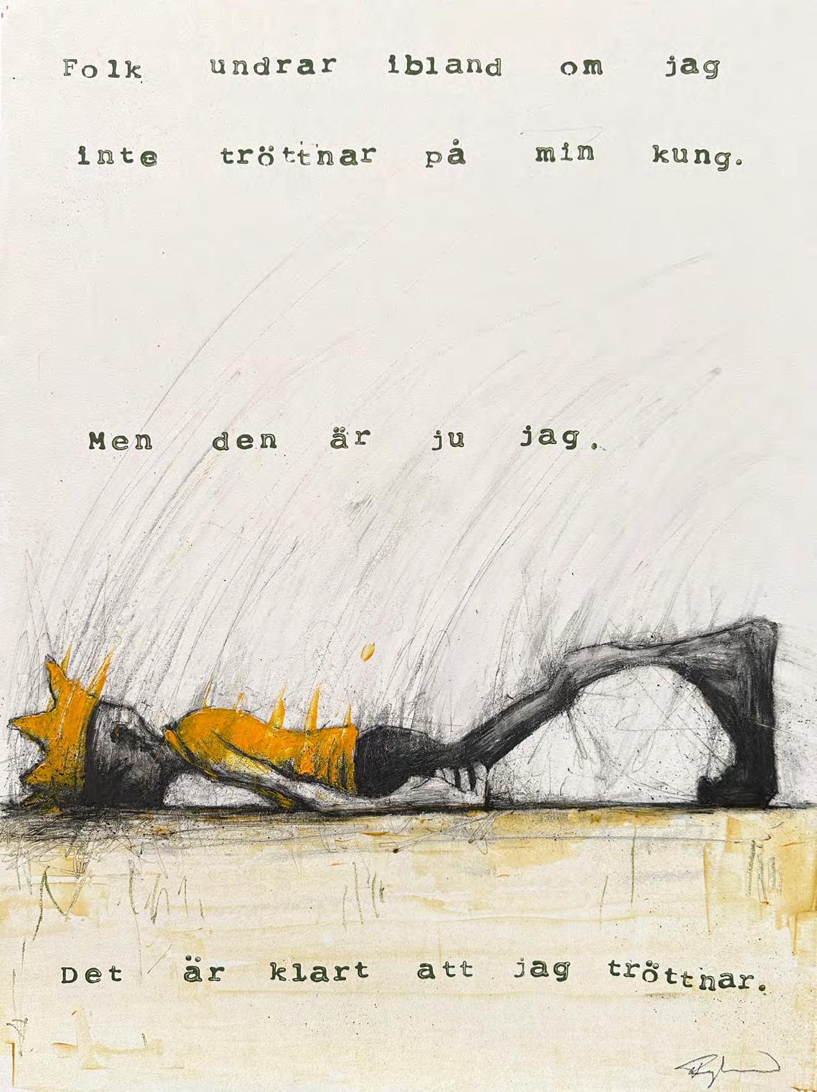 Å ena sidan är den obegripliga ondskan i världen och negativa nya människofientliga normer ständigt i mitt synfält. Å andra sidan märks ingenting av det i mitt dagliga liv. Inte i min ateljé, inte på min lilla badplats vid klipporna i det sommarljumma havet, inte i den fredliga stämningen på promenaden eller när jag umgås med familj och vänner. Det skapar en märklig dissonans mellan upplevd harmoni och läst disharmoni som nog kommer till uttryck i utställningen bl.a. i den monumentala målningen ”Revan”.