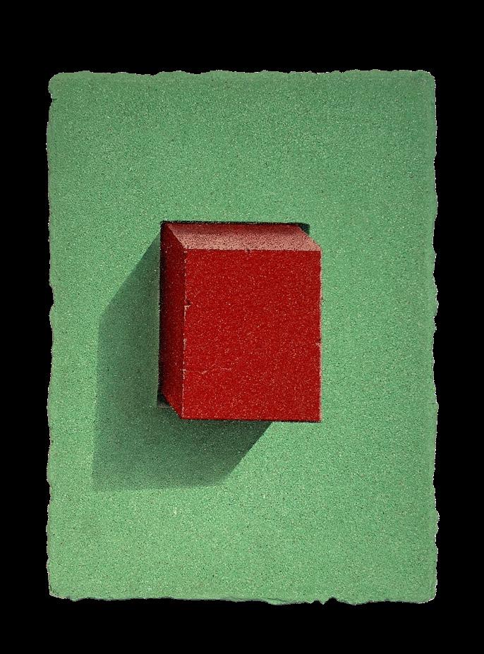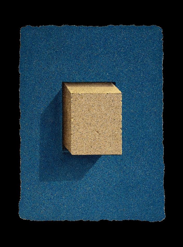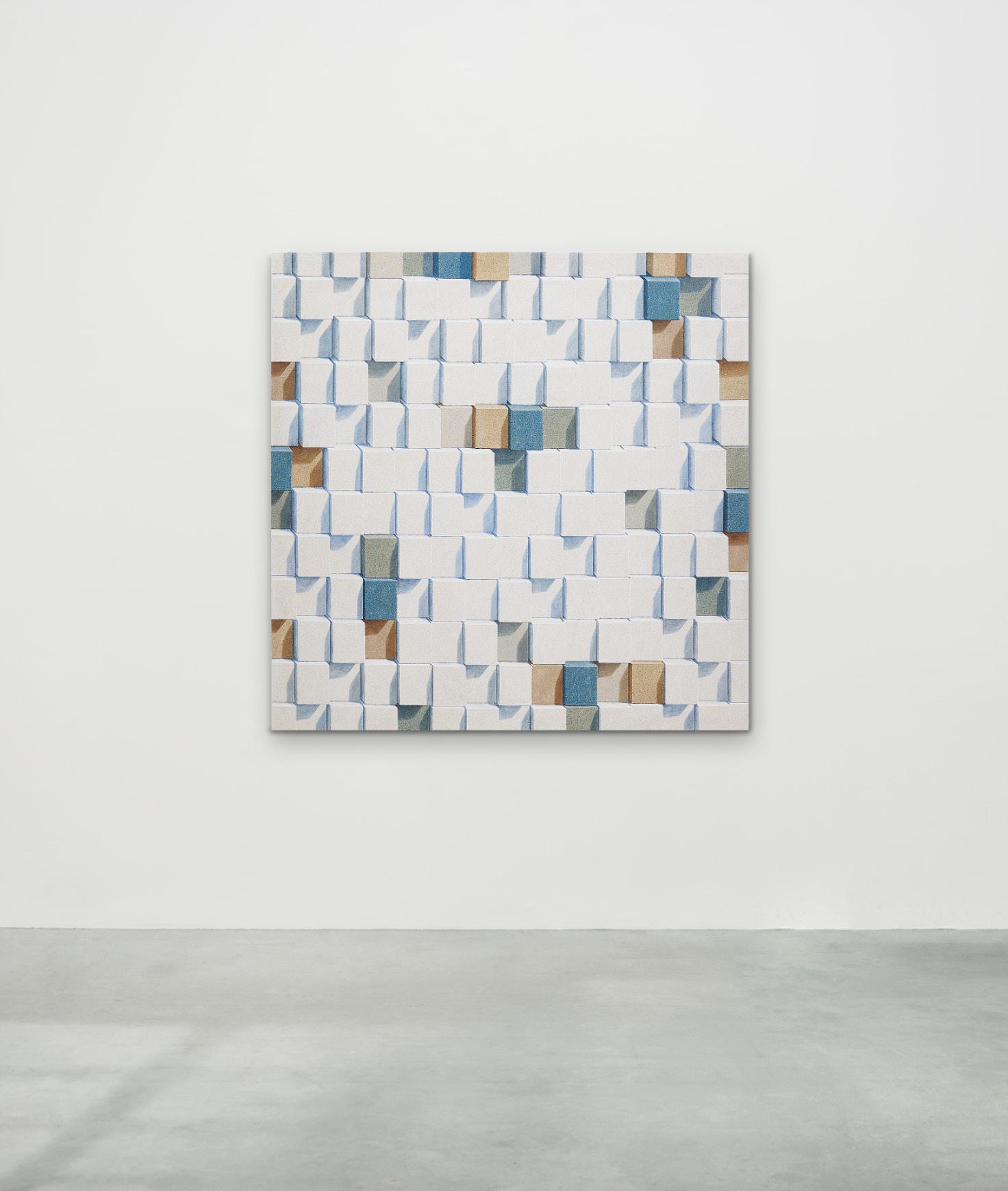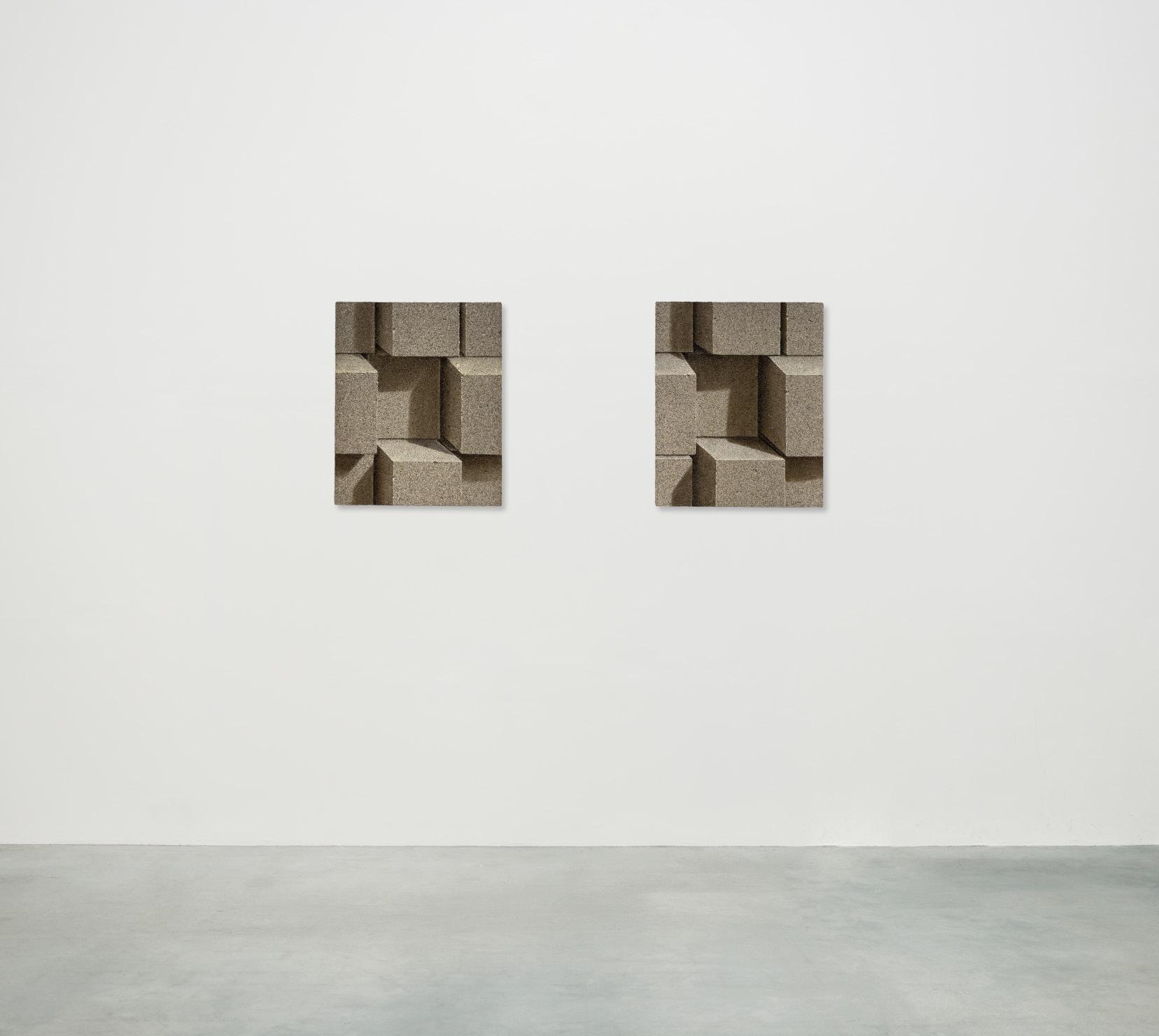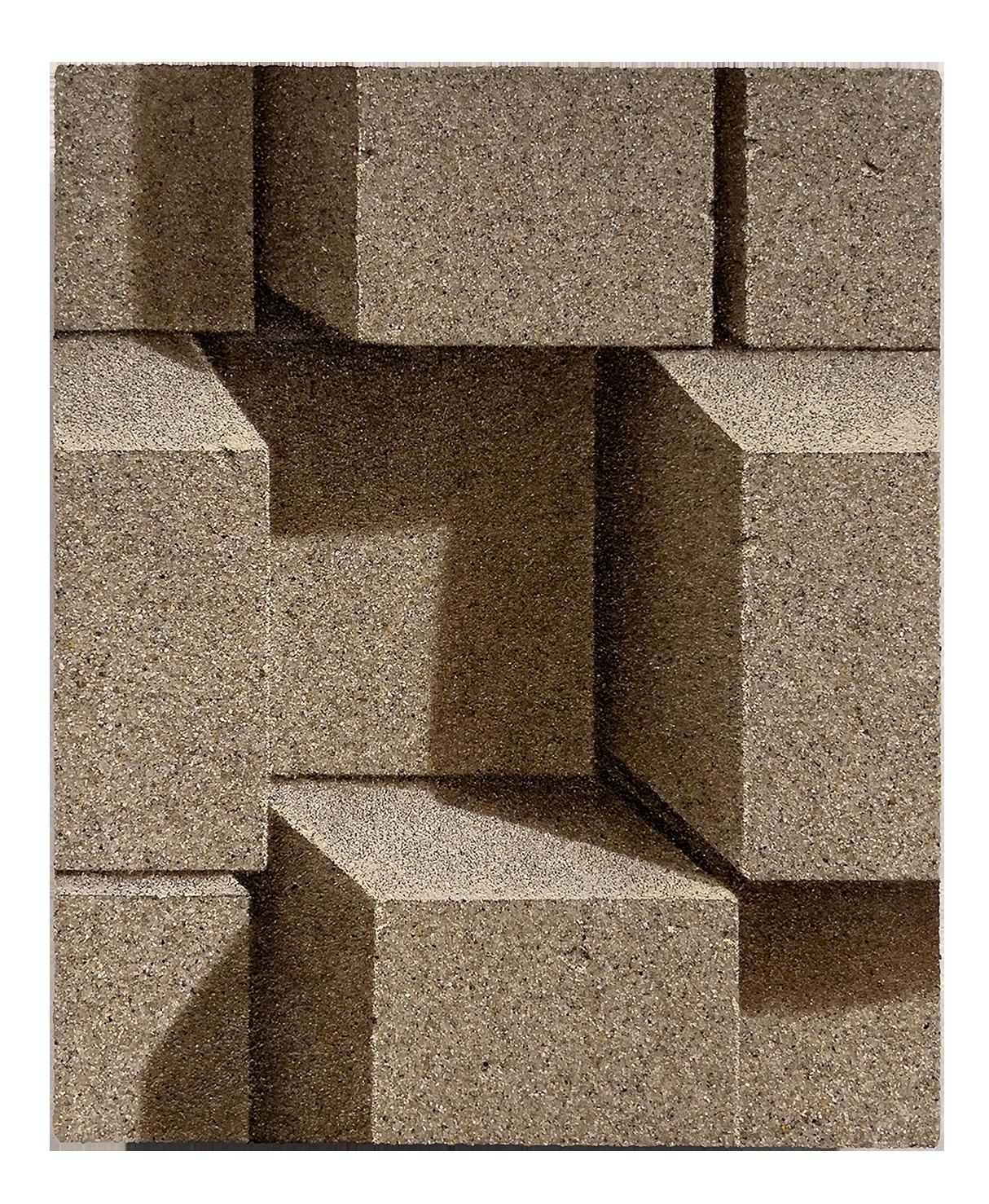 Sand and brick, his signature materials, gained new resonance through his New York experience. From a distance, the canvases appear photographic, yet up close, the densely layered grains of sand reveal themselves as tangible surfaces. This interplay between image and matter intensifies the tension between reality and illusion, compelling the viewer to ask: “What does it mean to see?”