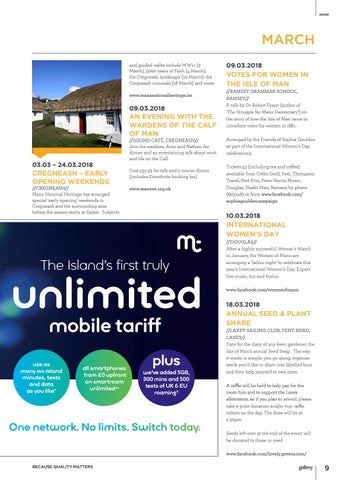 MARCH and guided walks include WW11 (3 March), 5000 years of Faith (4 March), the Cregneash landscape (10 March), the Cregneash cummals (18 March) and more. www.manxnationalheritage.im