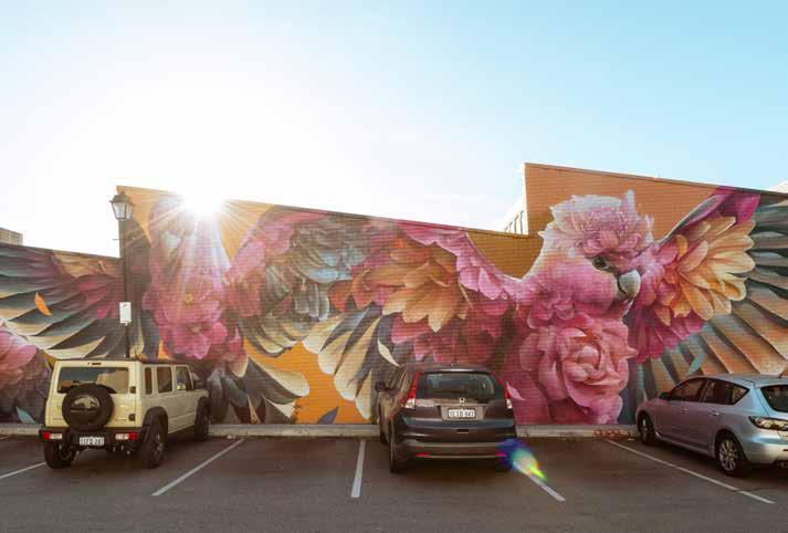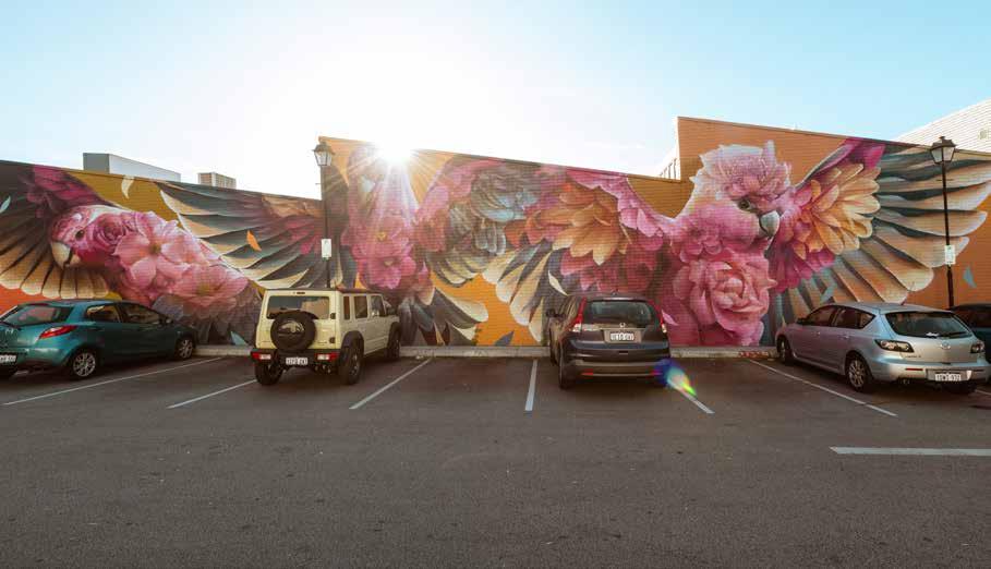 Next on the agenda would be to wander over to Denis Street to enjoy the enormous mural of two red-tailed black cockatoos, Karrak(2021) painted by James Giddy in support of conservation efforts to protect the native species. It sits across from a mural