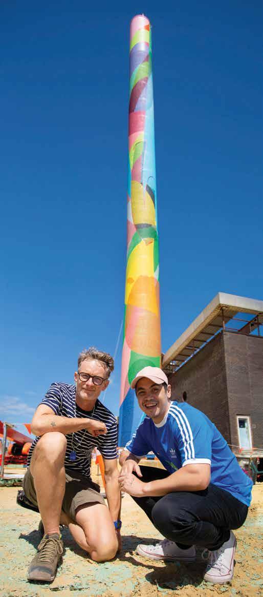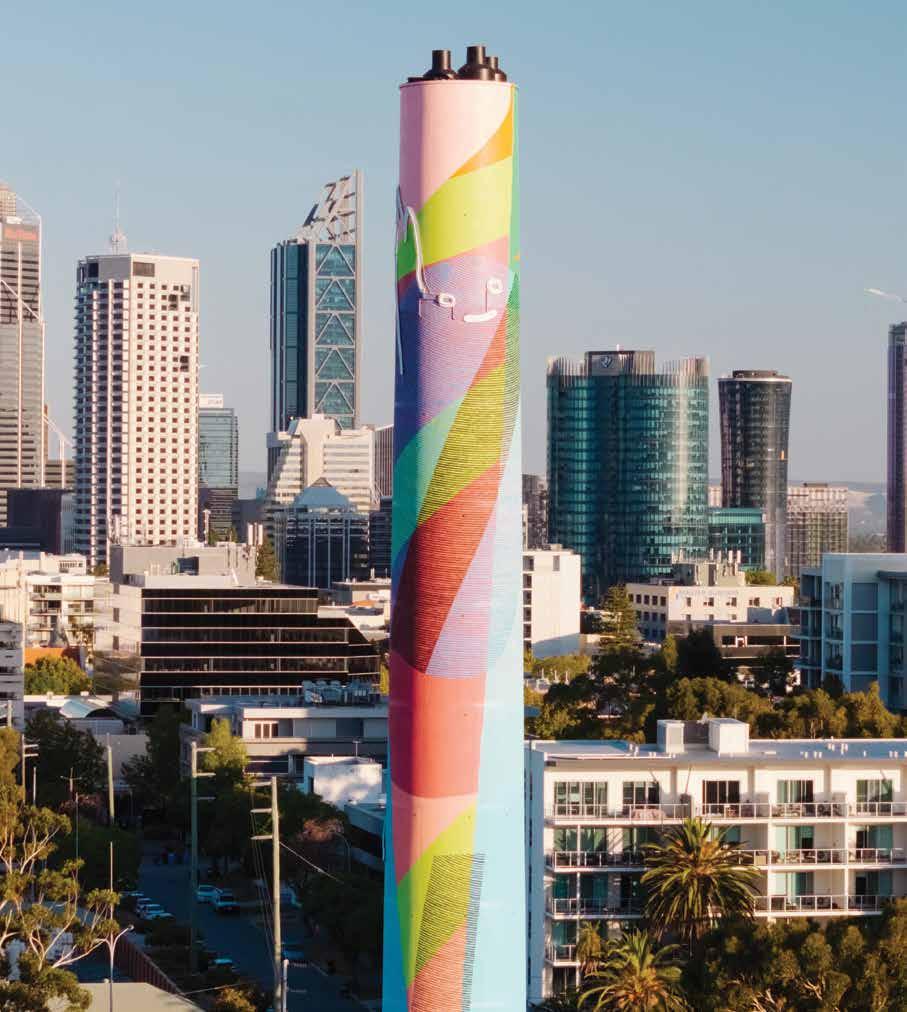 Completely unfazed by scaling the 53-metre Chimney Stack, the artists have loved the experience, with Perth’s blue sky and 180-degree ocean vistas to Rottnest as the backdrop while they apply paint.