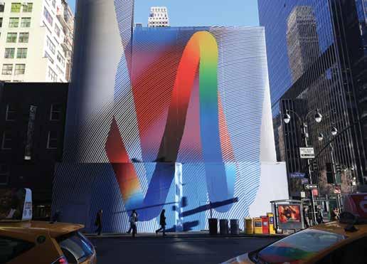 Below: Art Production Fund. NYC USA. MOMO (Dave Momyer) 2015. A doublefacade 5 story printed vinyl mural with the shape of a long ribbon of paint, stretched across the streets of Manhattan.