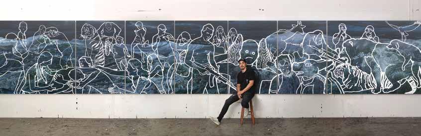 Bottom: Custodians , Abdul Abdullah, 2020. A large-scale and multi-panelled painting that spans over 11 metres in length. The work depicts an extensive, continuous scene of raging seas, overlaid with numerous figures rendered in Abdullah’s distinctive cartoon familiarity.