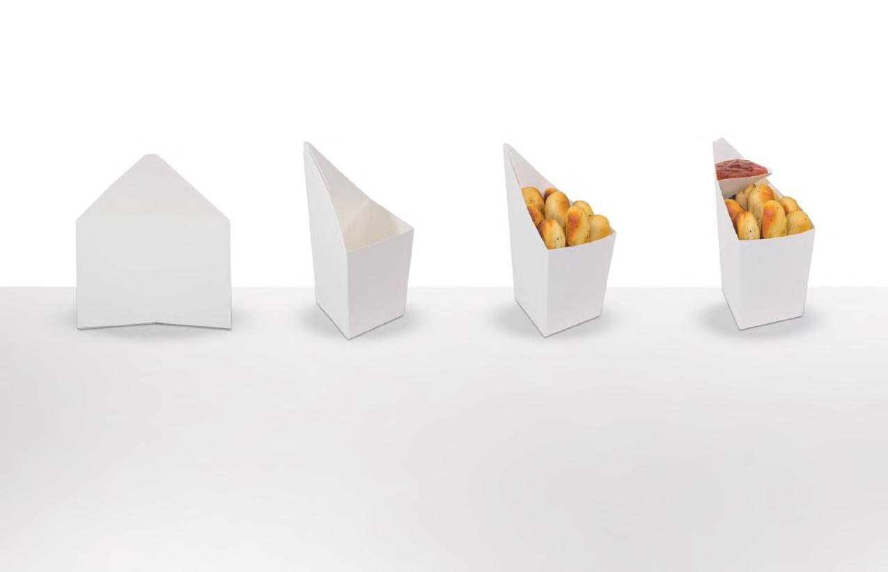 The Paper FlexCone™ is a patented, innovative solution for quick-service food—foldable, functional, and designed for one-handed, mess-free convenience. It pops open for fast service, folds flat for storage, and is fully recyclable.